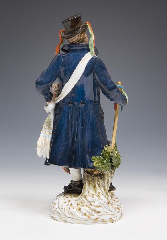Modell von Hugo Spieler 1897-1898. Aus einer Serie von 25 Trachtenfiguren. Farbig bemalt, gold staffiert. Ritzmarke, Pressmarke, Malermarke, Schwertermarke. Eine Hand, Stabspitze mit Schleifen restauriert.