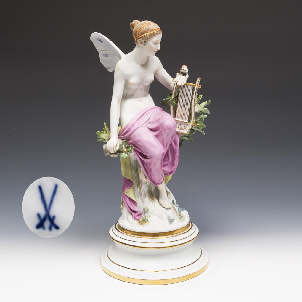 Modell von Rudolf Hölbe 1885. Pendant zu Modell-Nr. N 195 "Amor, Nachtigallen fütternd". Farbig bemalt, gold staffiert, montierte Plinthe. Pressmarke, Schwertermarken, Künstlersignet. Ast und Blätter, Lyraseiten restauriert.