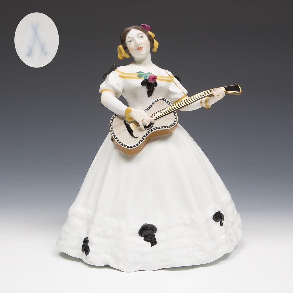 Modell von Erich Hösel 1912. Käthe Hyan, 1876-1958 Kingston, Berliner Kabarettsängerin, Gattin des Schriftstellers Hans Hyan. Farbig bemalt, gold staffiert. Unglasierter Boden, Ritzmarke, Pressmarke, Malermarke, Schwertermarke. Arme, Gitarre, Taille, Brustier restauriert.