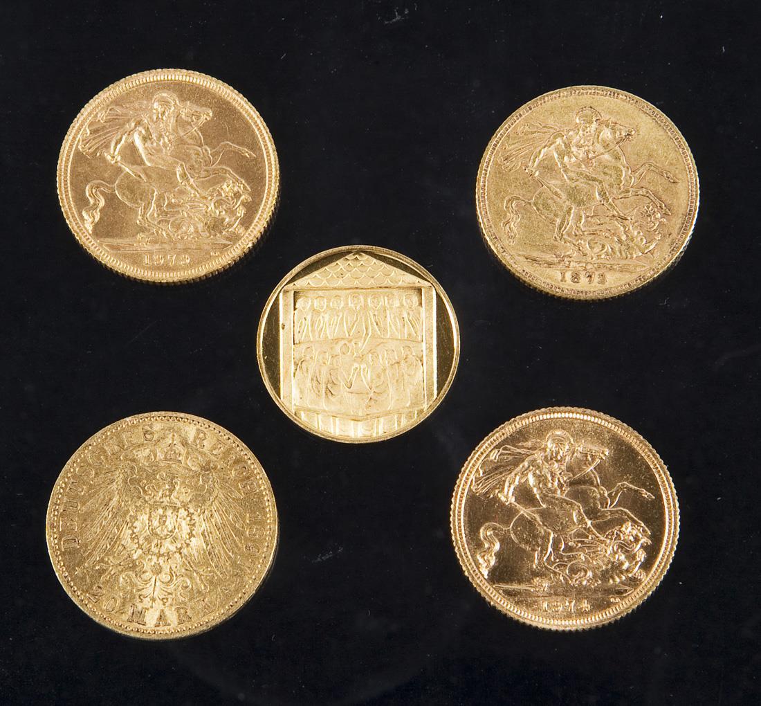 Großbritannien, Sovereign: - Elisabteth II Die Gratia Regina F.D. 1974. Rückseite: Heilige Georg, gerillter Rand, ø 22 mm, 8 Gramm - Elisabeth II Die Gratia Regina F.D. 1979. Rückseite: Heilige Georg, gerillter Rand, ø 22 mm, 8 Gramm - Victoria D.G. Britanniar Reg F.D. 1872. Rückseite: Heilige Georg, gerillter Rand, ø 22 mm, 8 Gramm. Deutsches Reich 1897, 20 Mark: - Wilhelm II Deutscher Kaiser, König v. Preussen. Rückseite: Reichsadler, glatter Rand, umlaufend Schriftzug Gott mit uns, ø 22,5 mm, 8 Gramm. Gedenkmünze: - Markuslöwe, Nehmet hin, das ist mein Leib, das ist mein Blut MAR 14/22 (Markus-Evangelium, Kapitel 14, Vers 22), rückseitig Abendmahl, Feingehalt: 900, ø 20 mm, 3,5 Gramm.