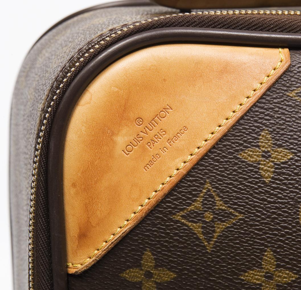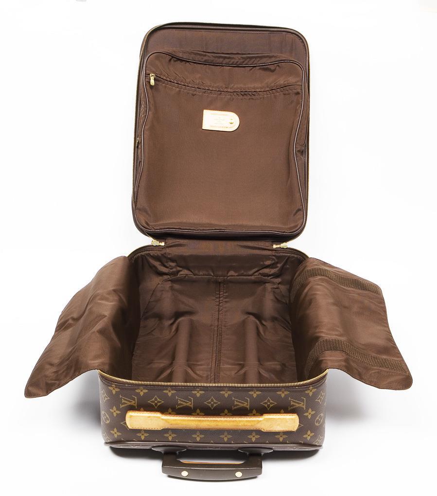 Paris, Made in France. Modell Pégase 50, Modell-Nr. M 23251. Classic LV-Monogramm Canvas, frontal Leder-Besatz, Hauptfach mit umlaufendem Zwei-Wege-Reissverschluss, außen eine offene Fronttasche, Leder-Tragegriff, Teleskop-Griff, Gummirollen. Textil-Innenfutter, innen zwei Reissverschluss-Fächer, ein Klettverschlussfach. Innen und außen Leder-Etikett: Louis Vuitton, Paris, Made in France. Handgepäckgröße. Rollen mit Gebrauchsspuren, sonst guter Zustand.