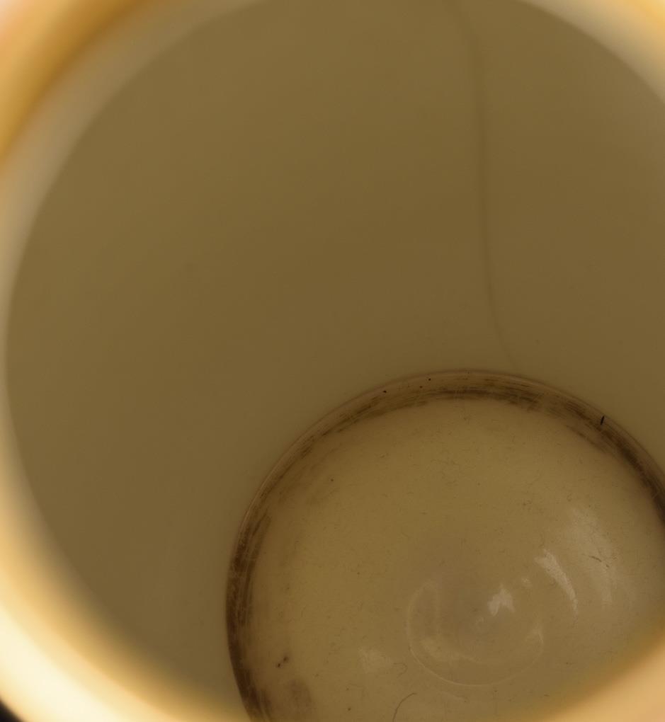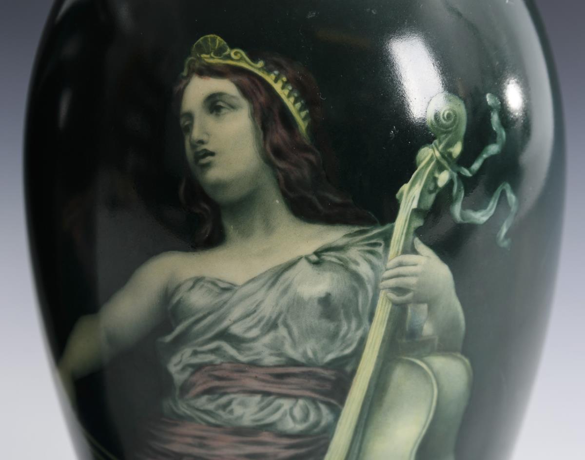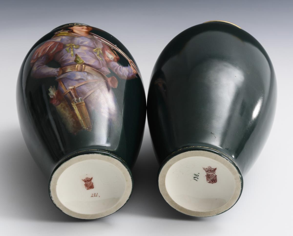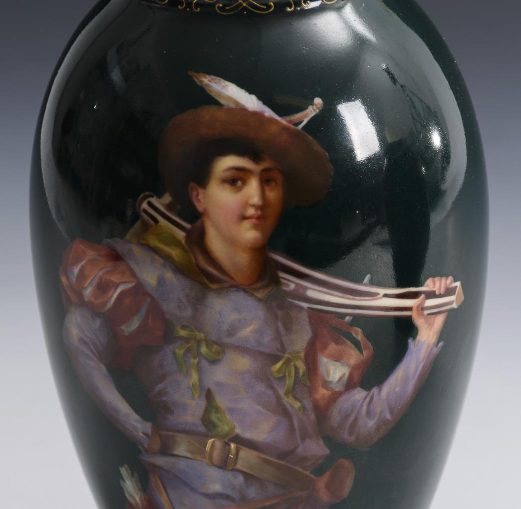 Ovoide Vasen mit dunkelgrünem Fond, 1x mit der Darstellung einer antikisch gekleideten jungen, ein Cello spielenden Frau und 1x mit der Darstellung eines jungen, historisierend gekleideten Mannes mit Armbrust. 1x Goldrand etwas berieben, 1x Wandungshaarriss.