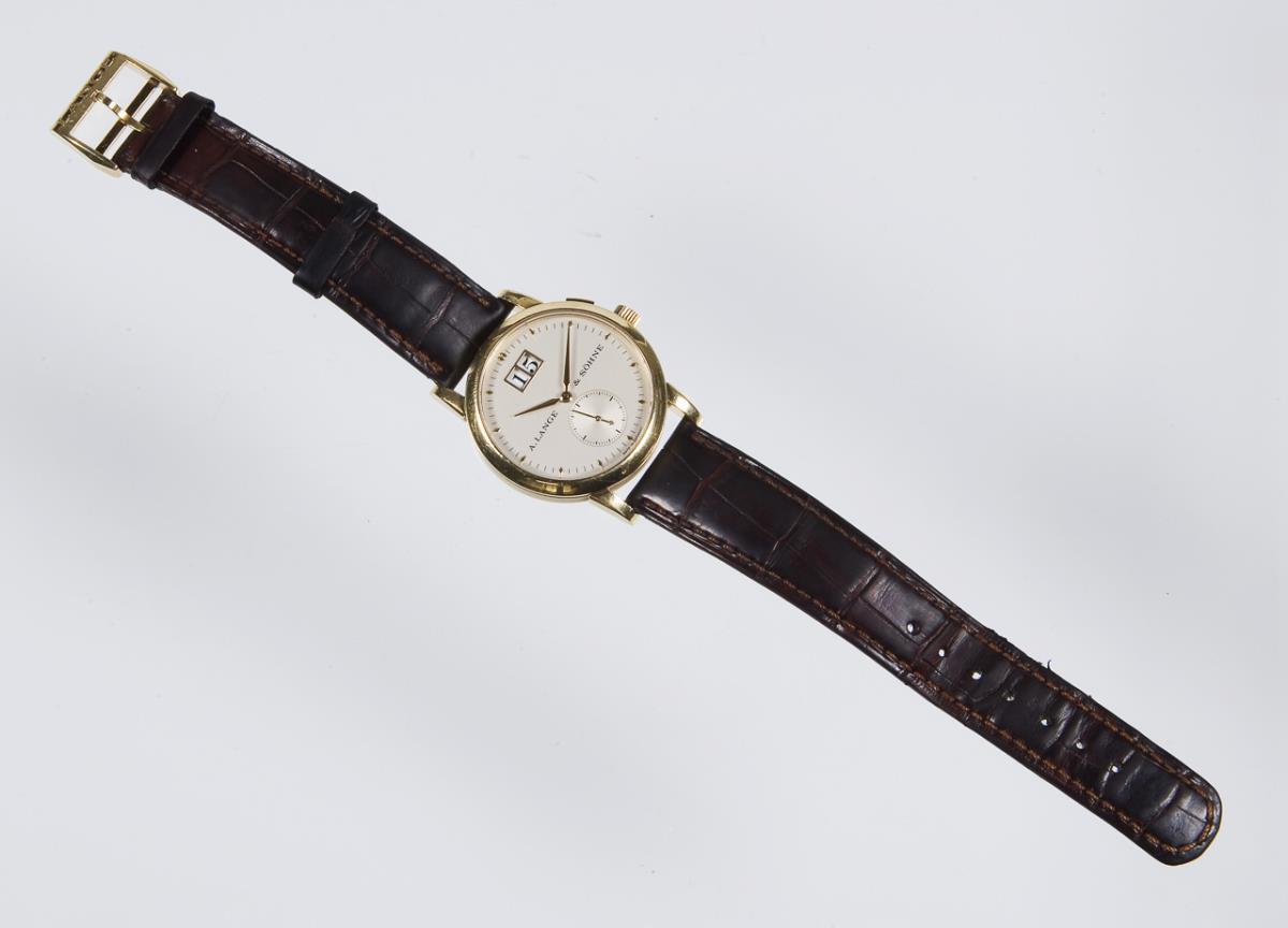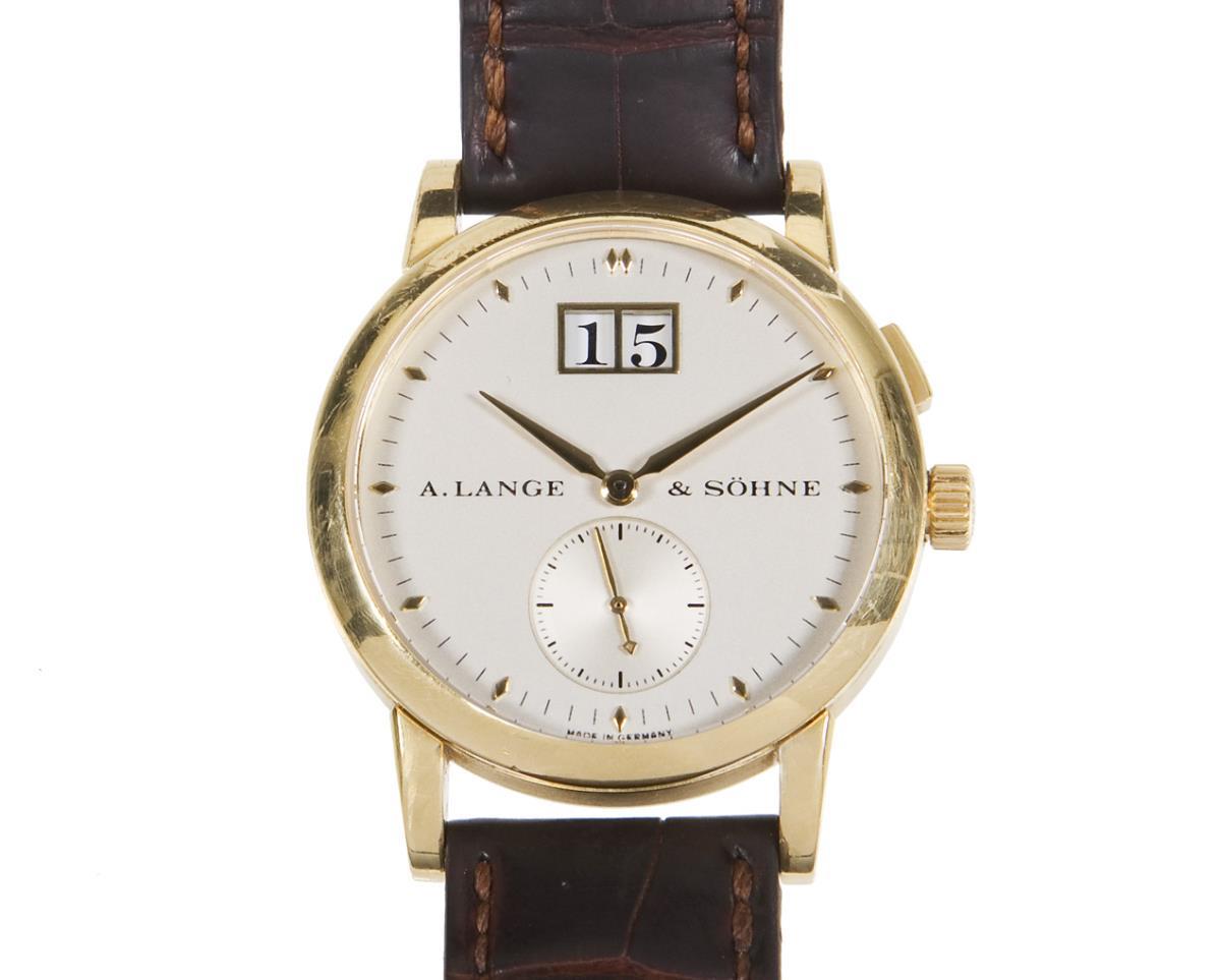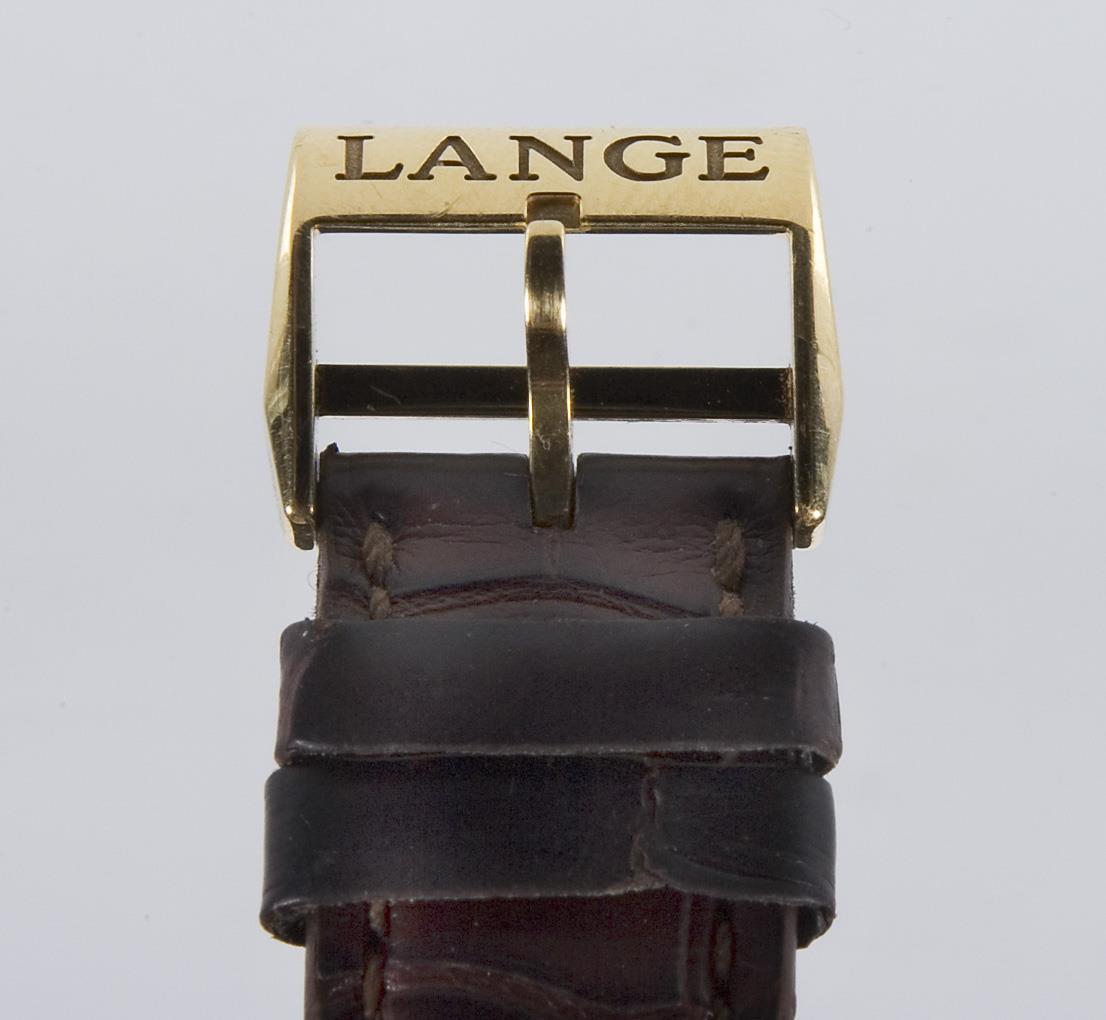 Handaufzug, Zifferblatt, Gehäuse und Werk signiert. Gehäuse mit verschraubtem Glasboden und Datum-Schnellkorrektur-Drücker. Dreiviertel-Platinen-Ankerwerk mit Genfer Streifen und gebläuten Stahlschrauben, in fünf Lagen reguliert, 30 Rubine, Schwanenhals-Feinregulierung, vier verschraubte Chatons, Gangdauer 42 Stunden, Kaliber L. 941.3. Silber-Zifferblatt, Goldzeiger, kleine Sekunde, großes Datum-Fenster. Original-Krokodil-Lederarmband mit Dornschließe in Gold. Zertifikat der Manufaktur A. Lange & Söhne, Glashütte in Sachsen. Neutrales Etui. Im Kurzzeit-Test funktionstüchtig.