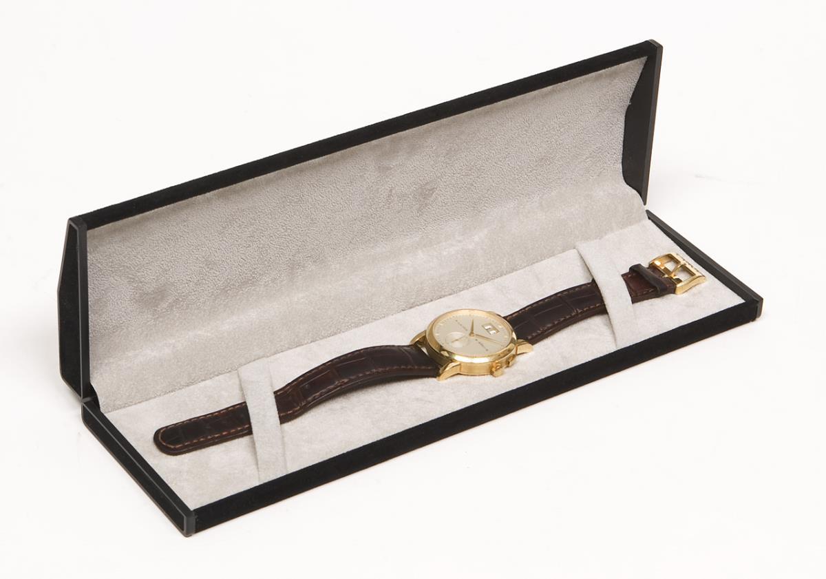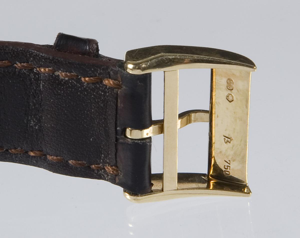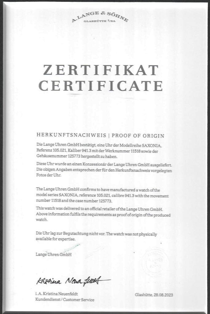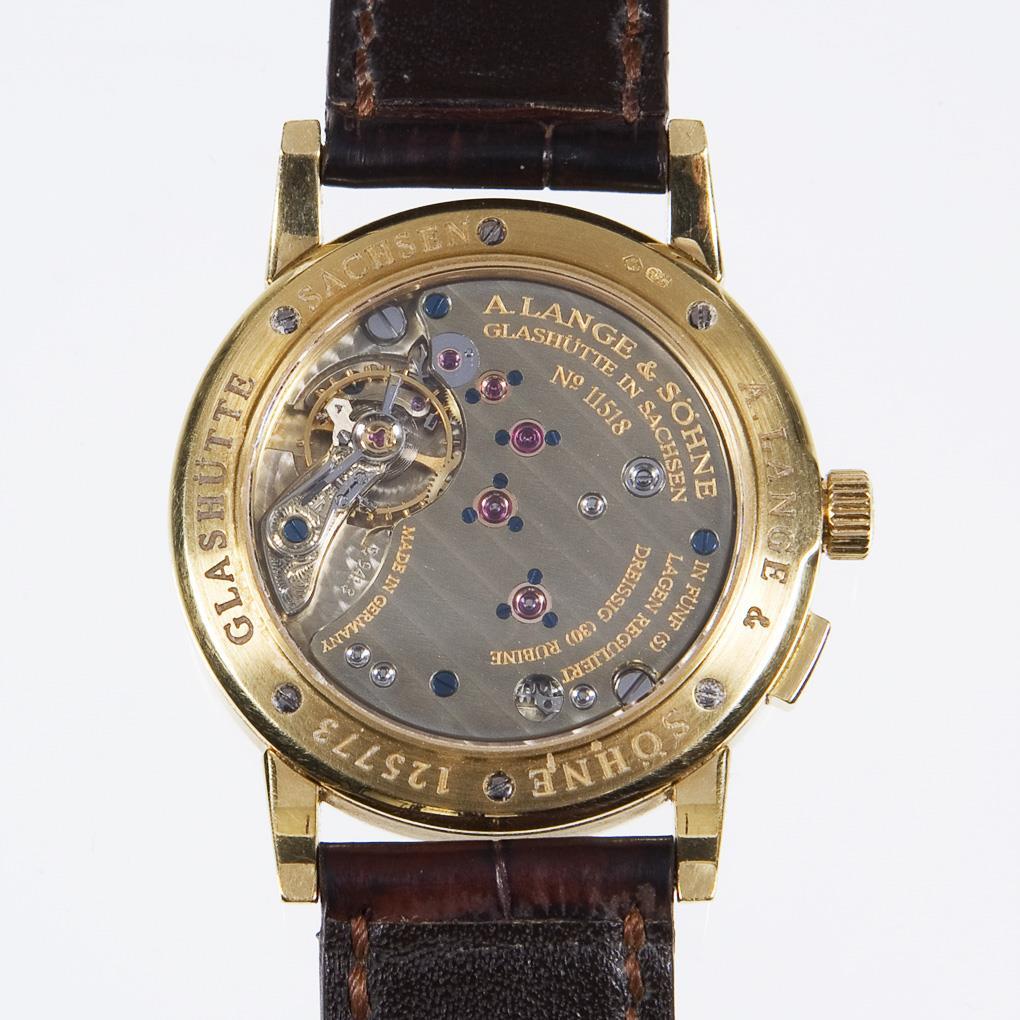 Handaufzug, Zifferblatt, Gehäuse und Werk signiert. Gehäuse mit verschraubtem Glasboden und Datum-Schnellkorrektur-Drücker. Dreiviertel-Platinen-Ankerwerk mit Genfer Streifen und gebläuten Stahlschrauben, in fünf Lagen reguliert, 30 Rubine, Schwanenhals-Feinregulierung, vier verschraubte Chatons, Gangdauer 42 Stunden, Kaliber L. 941.3. Silber-Zifferblatt, Goldzeiger, kleine Sekunde, großes Datum-Fenster. Original-Krokodil-Lederarmband mit Dornschließe in Gold. Zertifikat der Manufaktur A. Lange & Söhne, Glashütte in Sachsen. Neutrales Etui. Im Kurzzeit-Test funktionstüchtig.