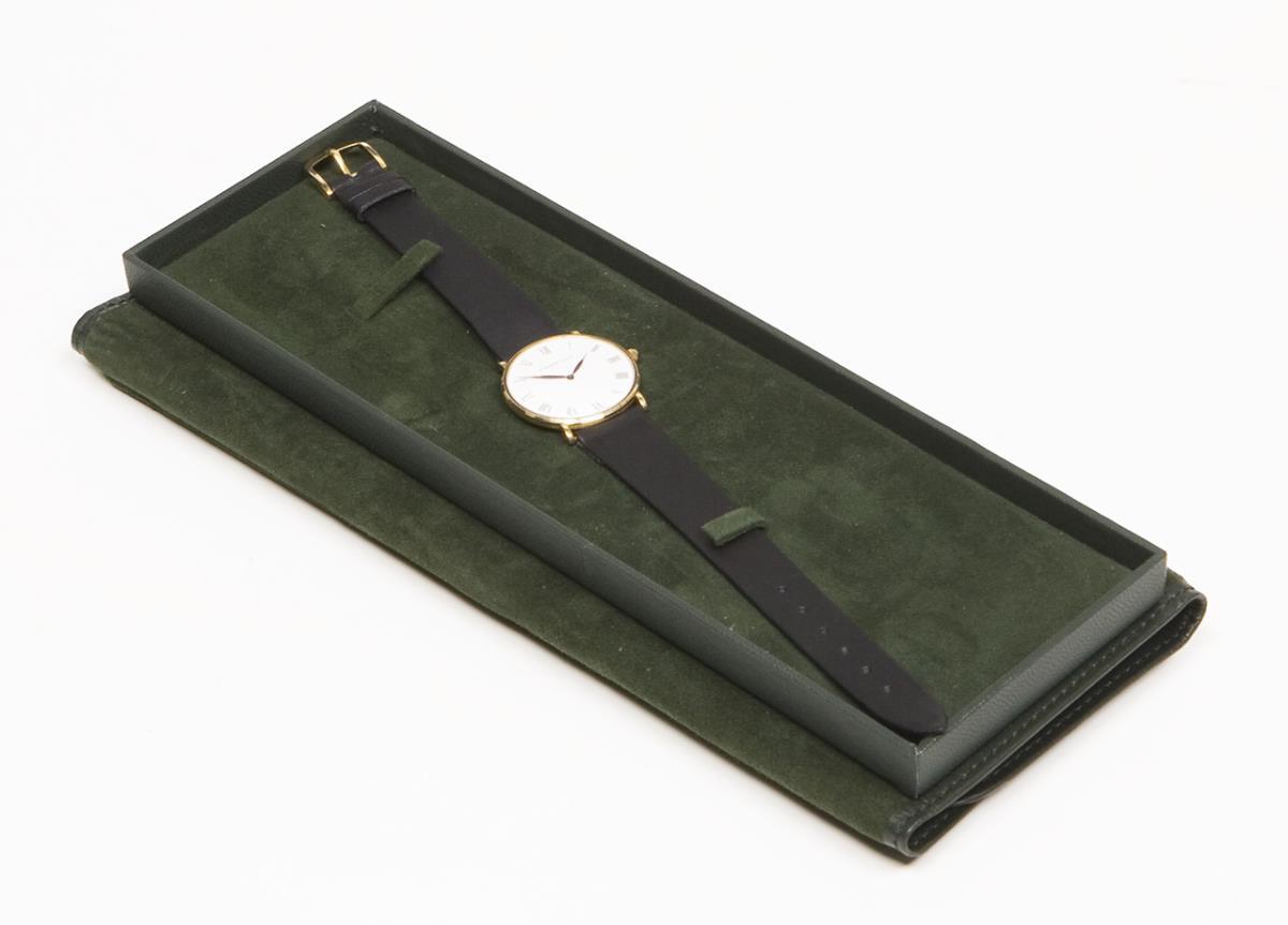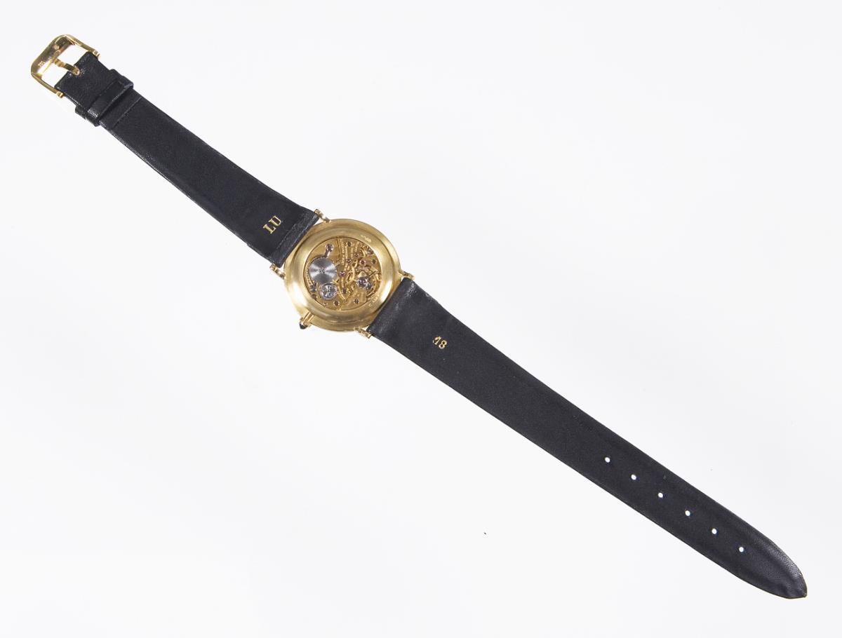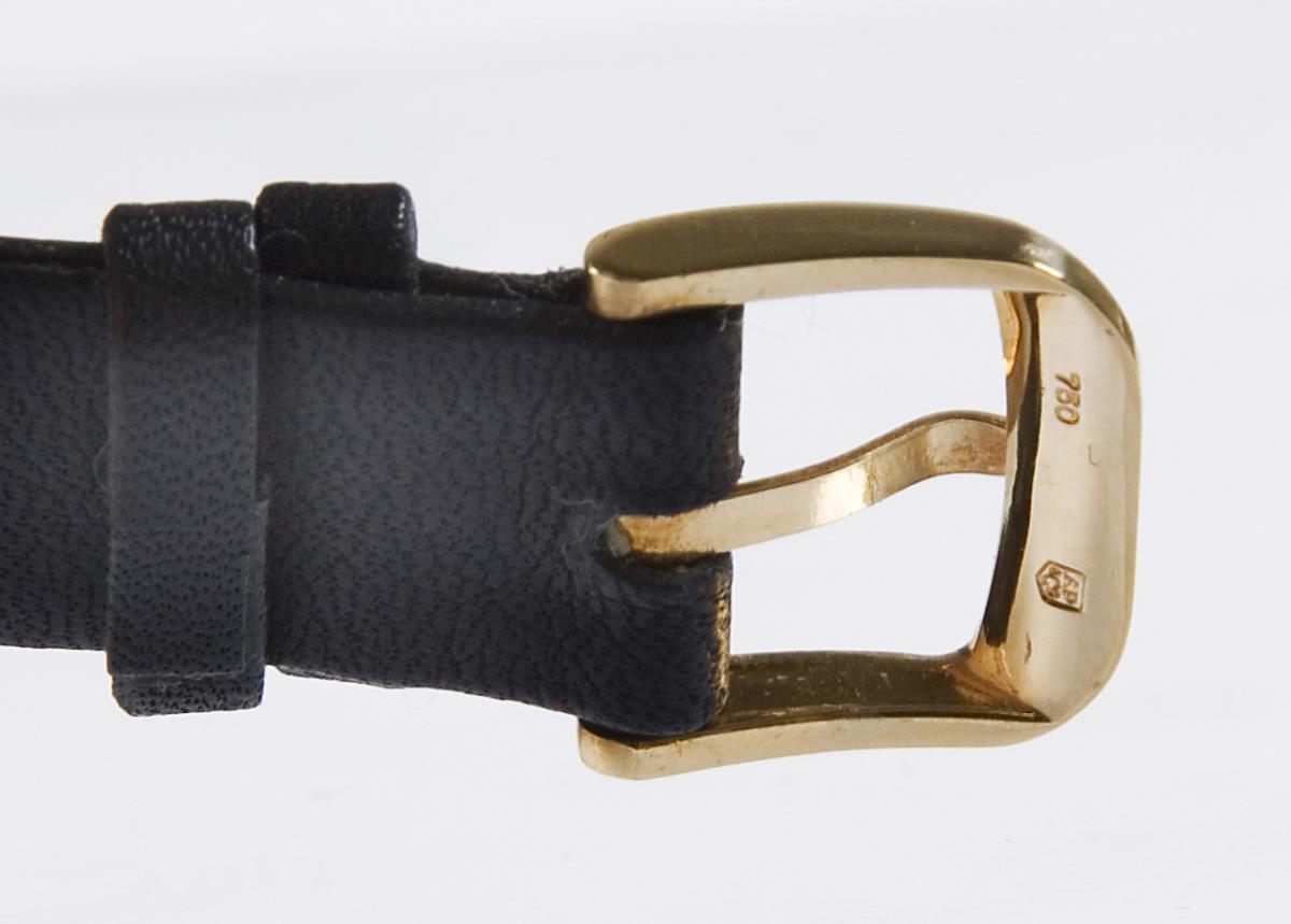 Handaufzug, Werk mit Genfer Streifen, 18 Jewels, weißes Email-Zifferblatt, schwarze römische Zahlen, verglaster Boden. Original-Lederarmband mit Dornschließe in Gold. Zertifikat, Original-Etui, Karton. Im Kurzzeit-Test funktionstüchtig.
