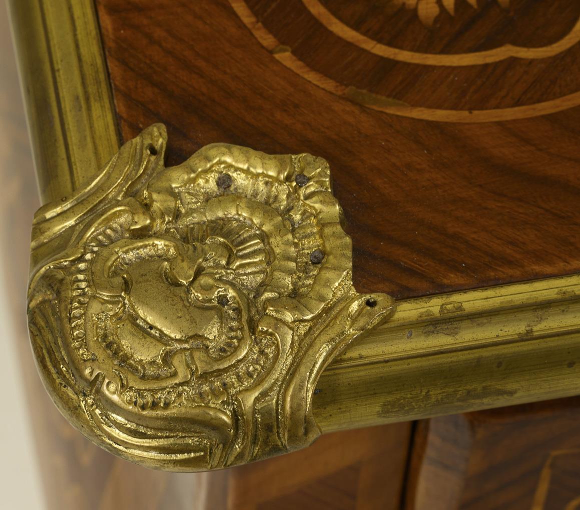 Großer Schreibtisch (sogenanntes "Bureau plat") mit rechteckiger Tischplatte auf leicht geschwungenem Korpus mit 4 geschweiften Pfeilerbeinen und geschweiften Zargen, über der Beinaussparung 1 mittlerer Schub, flankiert von 2 kleinen übereinanderliegenden Schüben; reich verziert mit allseitiger Blumenrankenmarketerie und Spiegelfurnier, akzentuiert mit umlaufendem Bronzeband und Bronzeapplikationen. Alters-/Gebrauchsspuren, Furnier mit kleinen Defekten, restauriert mit Ergänzungen.