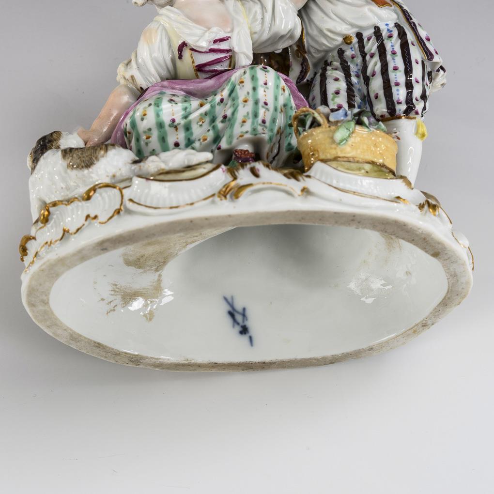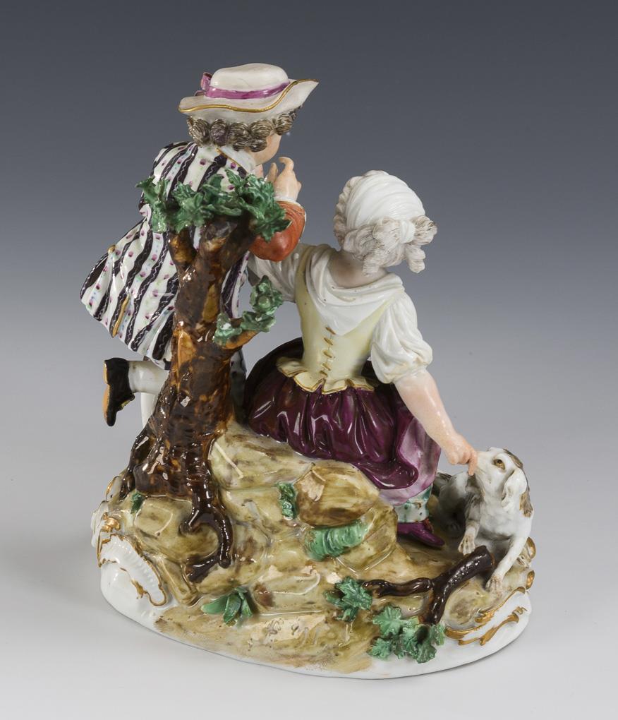 Kinderpaar mit Hund und Blumenkorb auf einem Natursockel. Bestoßungen an Blüten und Blättern, rechter Arm des Mädchens restauriert, Hutschleife des Knaben bestoßen.