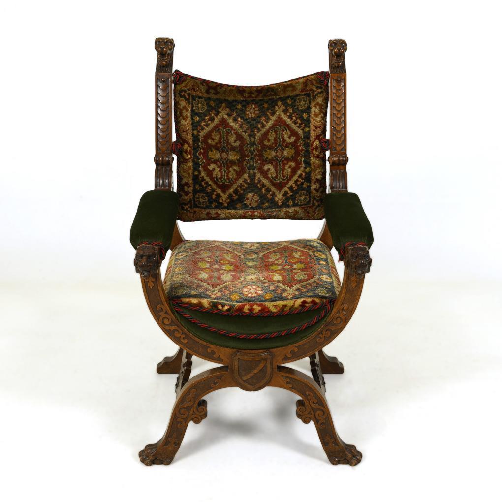 Gepolsterter Scherenarmlehnstuhl im Stil der Renaissance, verziert mit Reliefschnitzereien und plastischen Löwenköpfen; Bezug im Stil eines ornamentalen Knüpfteppichs und aus grünem Samt, verziert mit umlaufender, farblich passender Kordel. Alters-/Gebrauchsspuren, Polster und Bezug ergänzt.