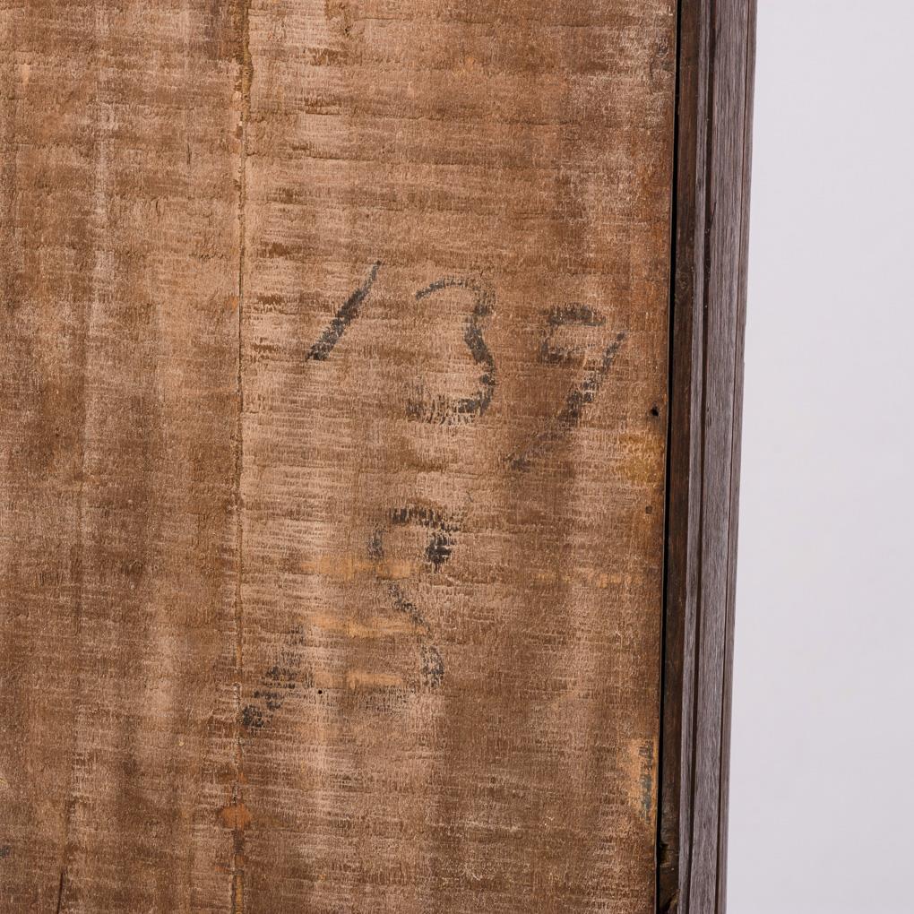 Eiche, massiv und dunkel gebeizt. Ca. 233 x 56,5 x 29 cm.