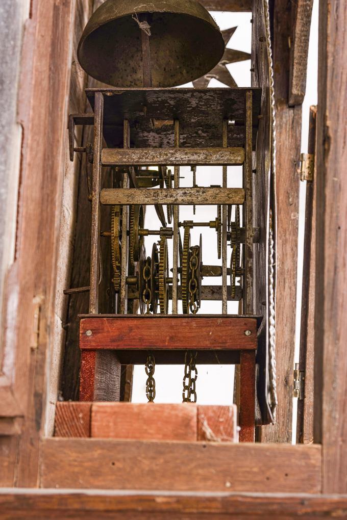 Messingräderwerk mit Halbstundenschlag auf Glocke. Funktion nicht geprüft. Verziertes Messingschild mit versilbertem Ziffernring, römischen und arabischen Zahlen, Arkadenminuterie und Eisenzeigern, im Rundbogenfeld graviert "J J Maquet, Orloger à Burdinne".
