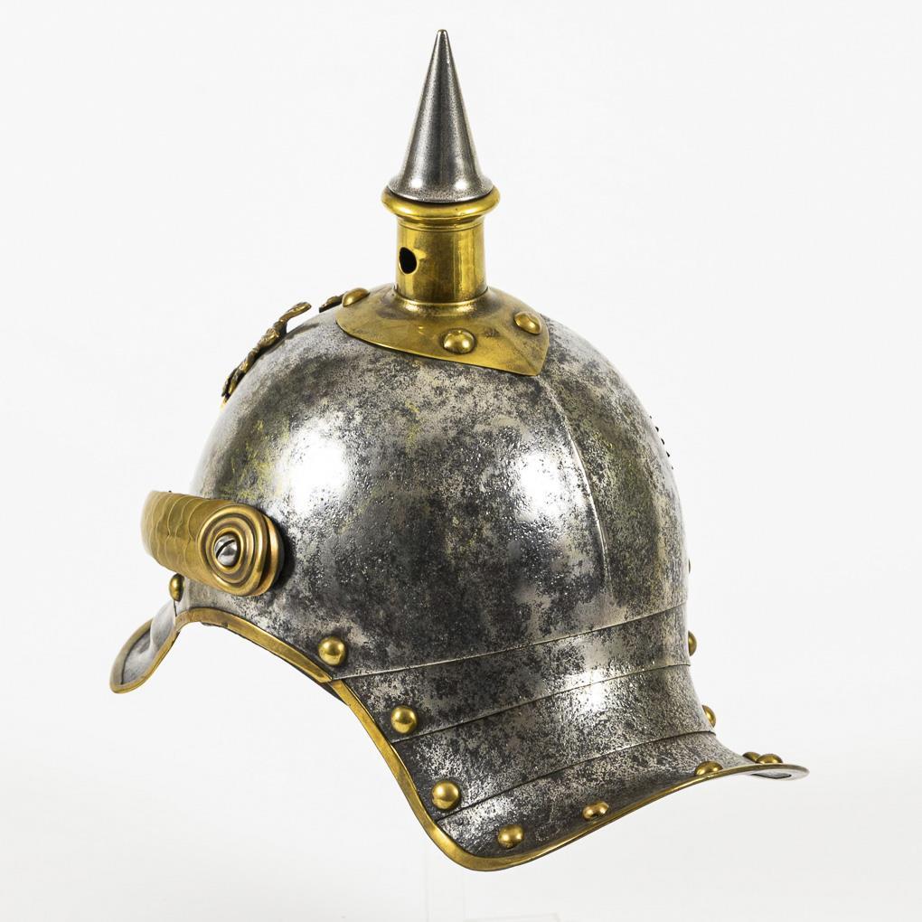 Modell 1867 der Linienkürassierregimenter 3, 4, 5, 7 und 8. Eisen mit großer Messingapplikation des preußischen Wappens, Schuppenkette und preußische Kokarde. Innen geritzte Zeichnung, altes ledernes Innenfutter, einige Schrauben wohl ergänzt und Stellen mit Metallflicken. Vorderschirm grün lackiert, Nackenschirm mit schwarzem Leder. Korrosionsnarben, stärkere Altersspuren, eine Niete an der Spitze fehlt, Reichskokarde fehlt.