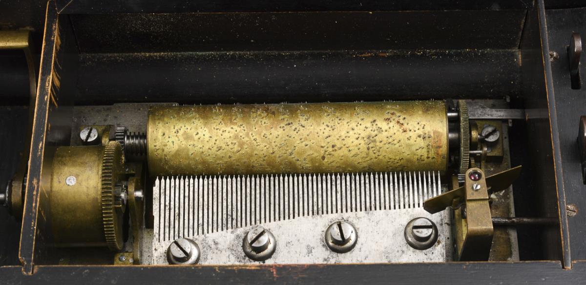 Quaderförmige Walzenspieluhr mit Ratschenaufzug und 2 innen liegenden Stellhebeln. Unter verglastem Deckel ungemarktes Werk mit steingelagertem Windrad, Stiftwalze und Zungenkamm 11,5 cm. Läuft ohne Klirren, Ausschalthebel ohne Funktion. Gehäuse mit Alters-/Gebrauchsspuren und Anobienspuren.