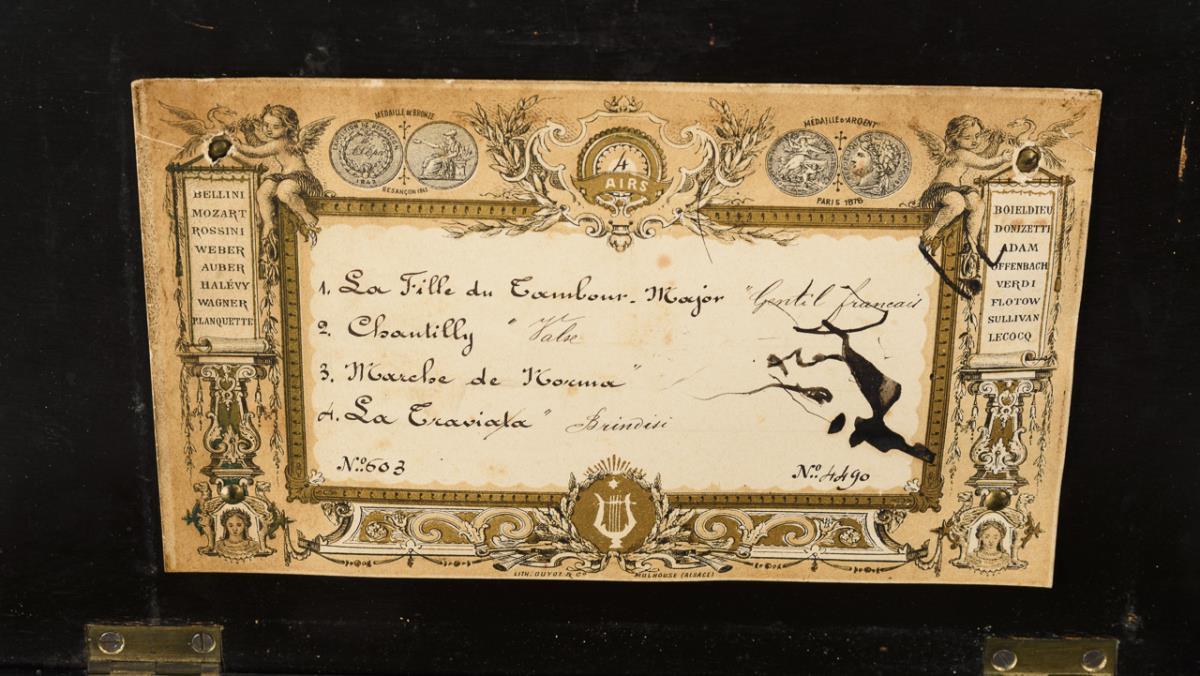 Im Deckel Lithografie mit Liederauflistung und Nr. 603 und 4490, unter dem Boden alter Schriftzug und Stempel "T.S". Um 1900.