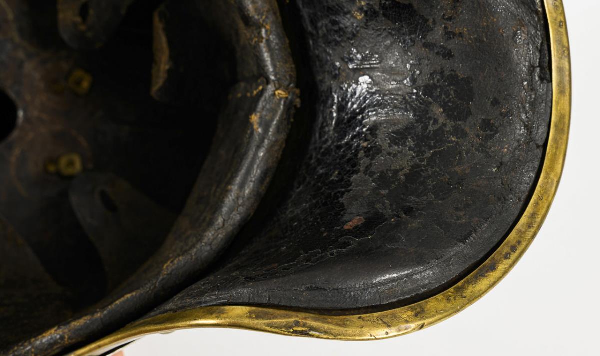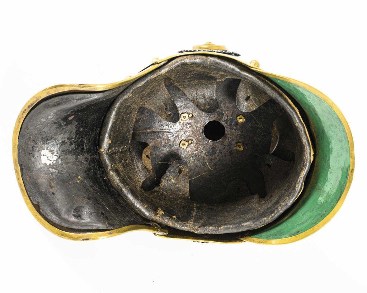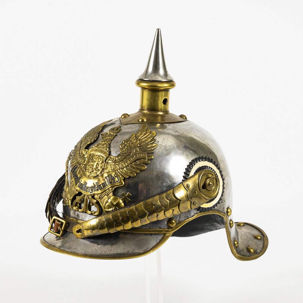 Model 1889/97, polierte Stahlglocke. Einfassung, Spitzenbasis sowie Adler mit Bandeau "Hohenfriedberg 4. Juni 1745" und Schuppenkette aus Messing. Lederinnenfutter, grün lackierter Stirnschirm und schwarzes Leder am Nacken (etwas locker und kurz). Messingrand am Nackenschirm etwas unregelmäßig und mit kleinen Defekten. Schuppenkette zu kurz, um ohne Lederriemen unter dem Adler geschlossen zu werden. Innen doppelte Bohrlöcher an der Spitzenplatte, leichte Dellen.