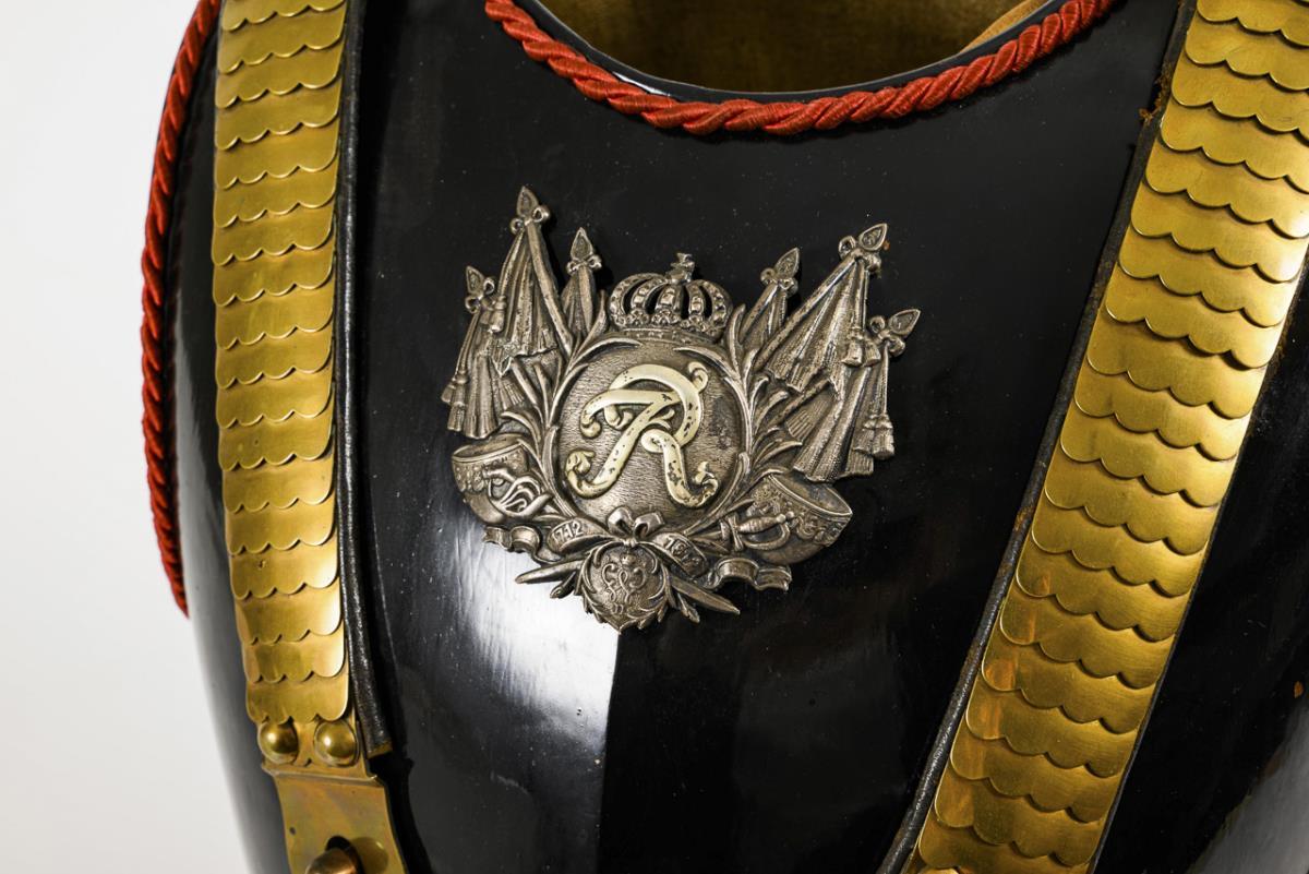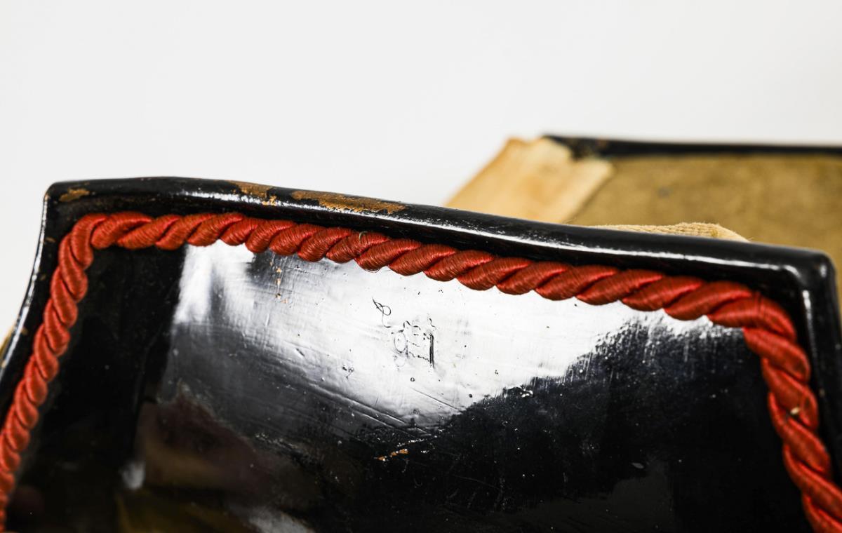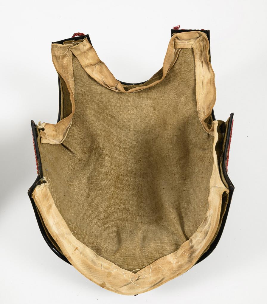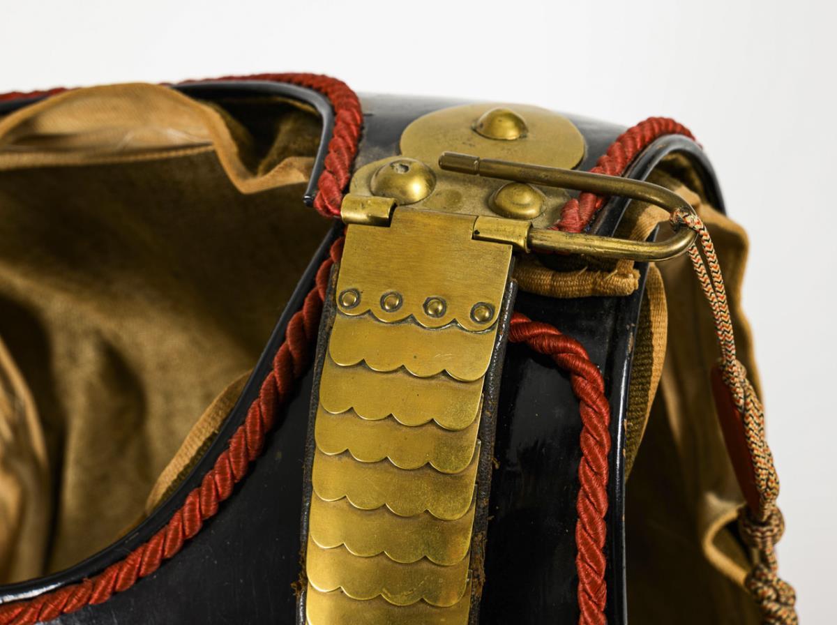 Modell 1897. Eisen, verkupfert und dann schwarz lackiert, Messing-Nieten und umlaufende rote Kordel. Schuppenketten aus Messing. Lederner Bauchriemen, ursprünglich schwarz (stark berieben). Silbernes Trophäen-Emblem von 1912 (locker, ohne Muttern). Innen grober Leinenbezug. / Dazu Schützenschnur in Schwarz-Weiß-Rot. Minimale Kratzer.