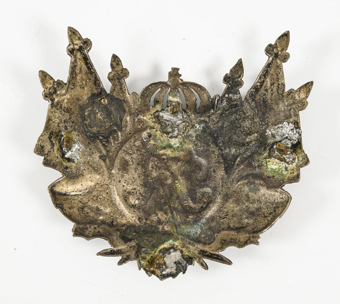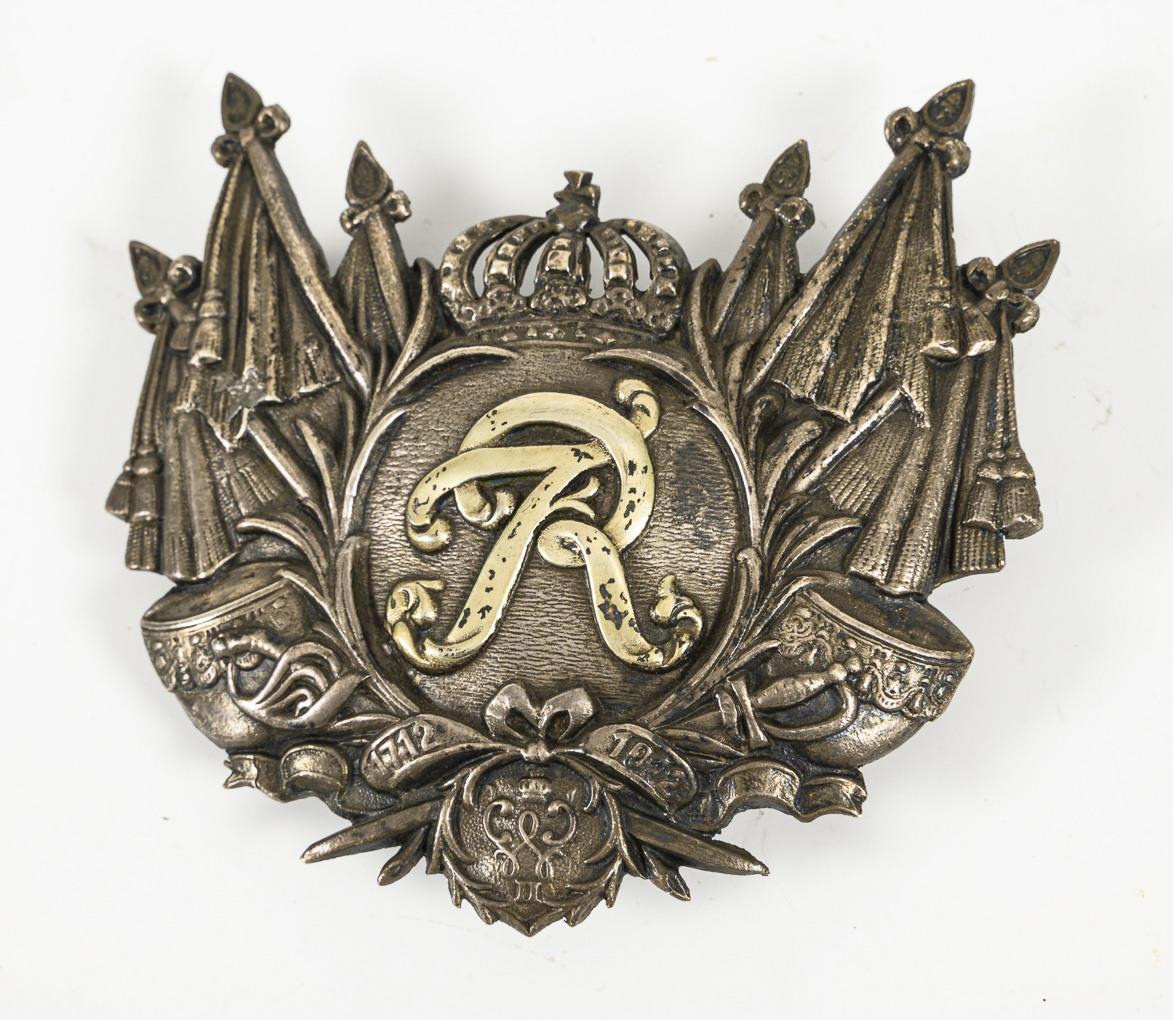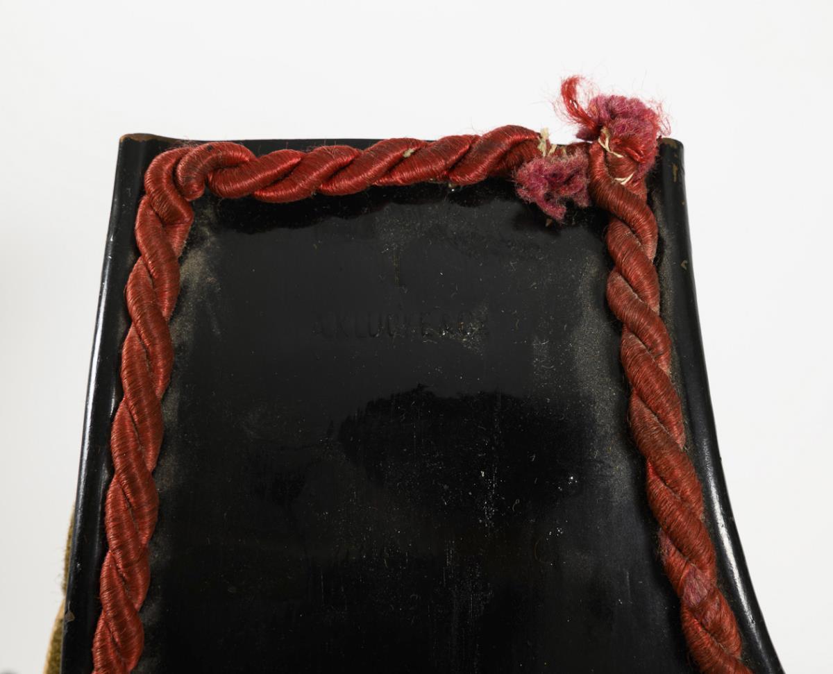 Modell 1897. Eisen, verkupfert und dann schwarz lackiert, Messing-Nieten und umlaufende rote Kordel. Schuppenketten aus Messing. Lederner Bauchriemen, ursprünglich schwarz (stark berieben). Silbernes Trophäen-Emblem von 1912 (locker, ohne Muttern). Innen grober Leinenbezug. / Dazu Schützenschnur in Schwarz-Weiß-Rot. Minimale Kratzer.