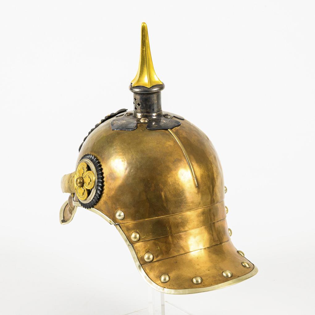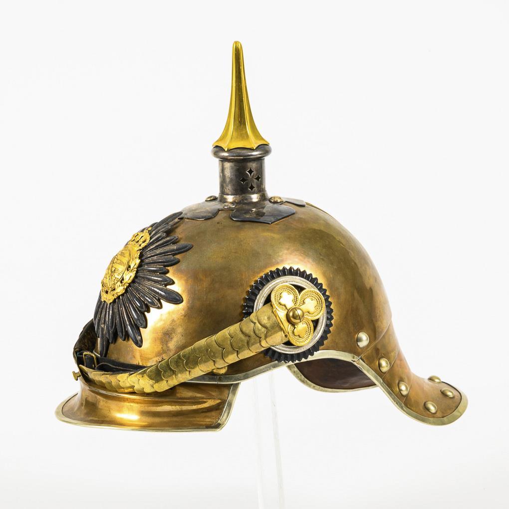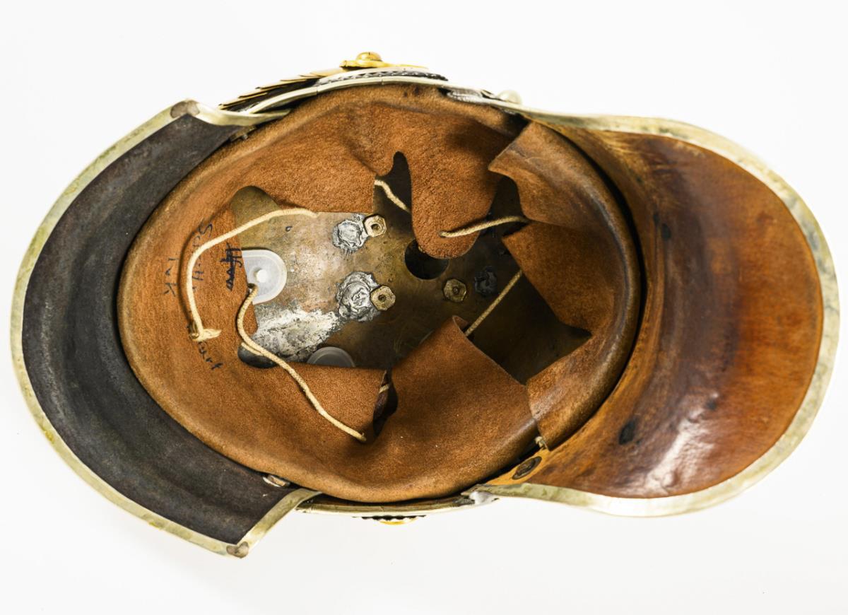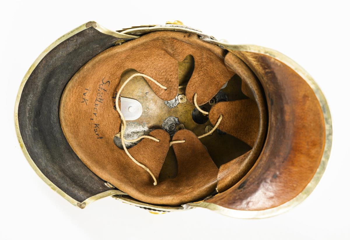 Tombakhelm mit silbernem Kreuzblatt und kurzer, kannelierter, vergoldeter Spitze. Silberner Stern mit vergoldetem Wappen, Schuppenkette mit Kreuzblatthalterung, Preußische- und Reichskokarde. Innen zahlreiche Verlötungen, neu eingesetztes Lederfutter, Stirnschild mit schwarzem Leder und Nackenschild mit braunem Leder verkleidet.