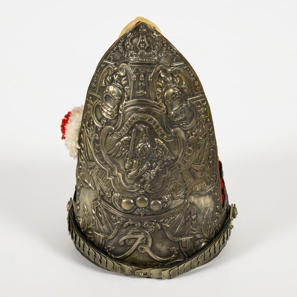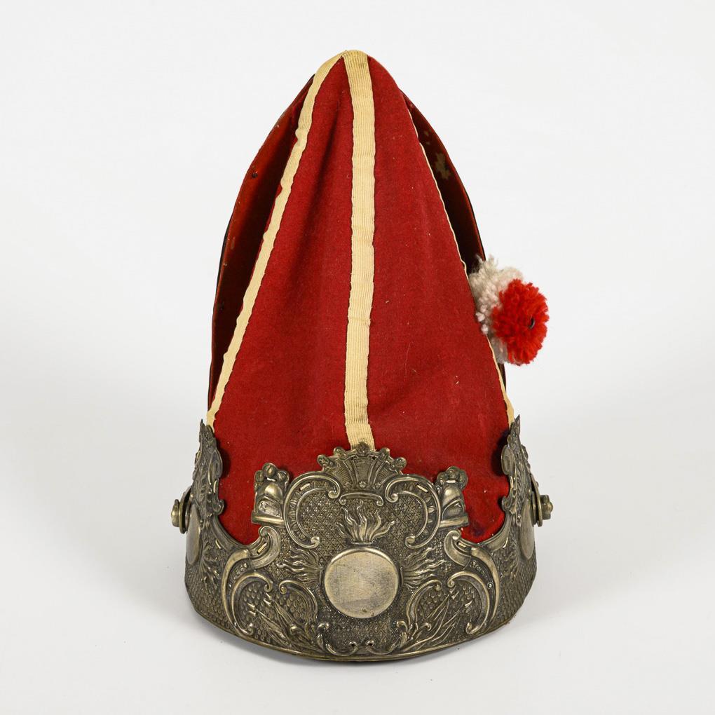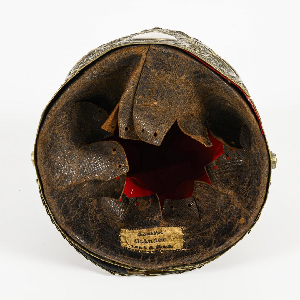 Modell 1894. Großes geprägtes Metallschild mit Schuppenkette. Roter Stoff mit etwas Mottenfraß, ledernes Schweißband mit Eigentumsschild "Grenadier Ständer 7. ...G.R. (z.F.?)". Quastenspitze wohl ergänzt, unter dem Lederband blauer Filz unterfüttert. Fall der rote Stoff ergänzt wurde, dann sehr professionell.