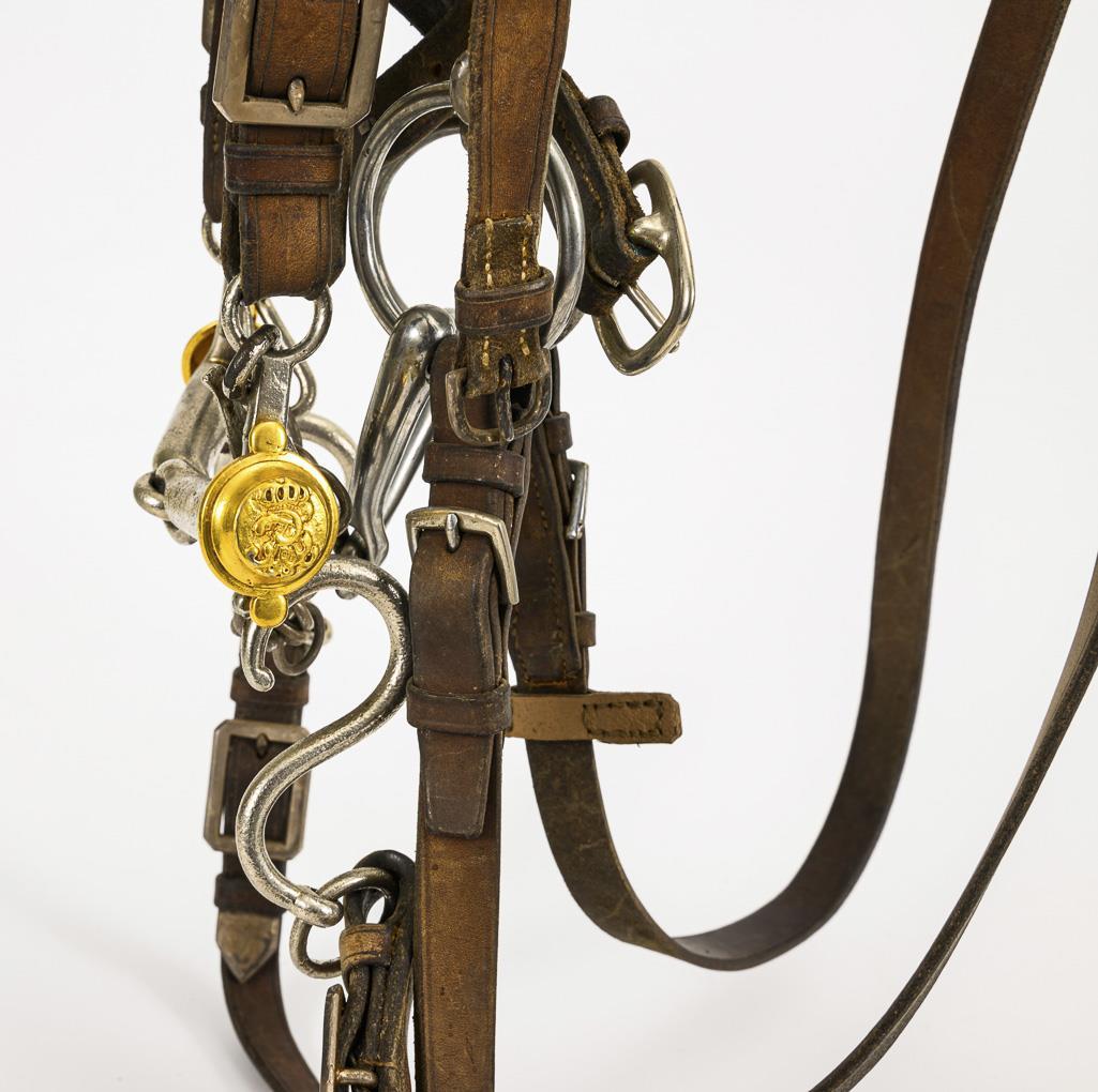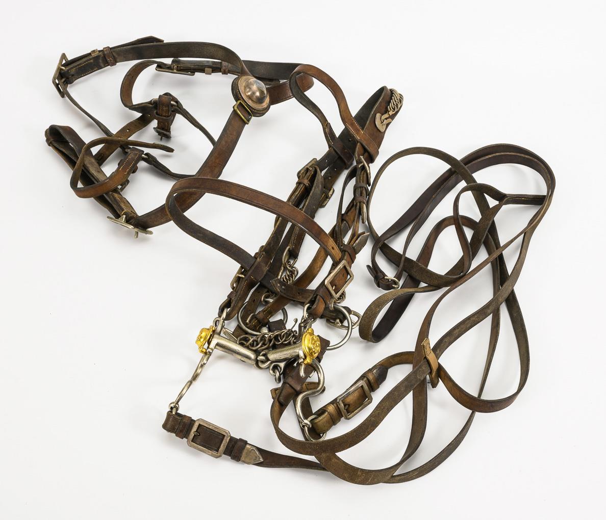 Wohl vollständiges Pferde-Zaumzeug für Militärpferde. Monogramm "FWR" (für Friedrich Wilhelm IV.). Unter anderem mit: einfach gebrochener Kandare, Kinnkette, Nasenriemen, Reithalfter, Genickriemen mit Kettenzier, 2 Zügel und einfach gebrochene Wassertrense.