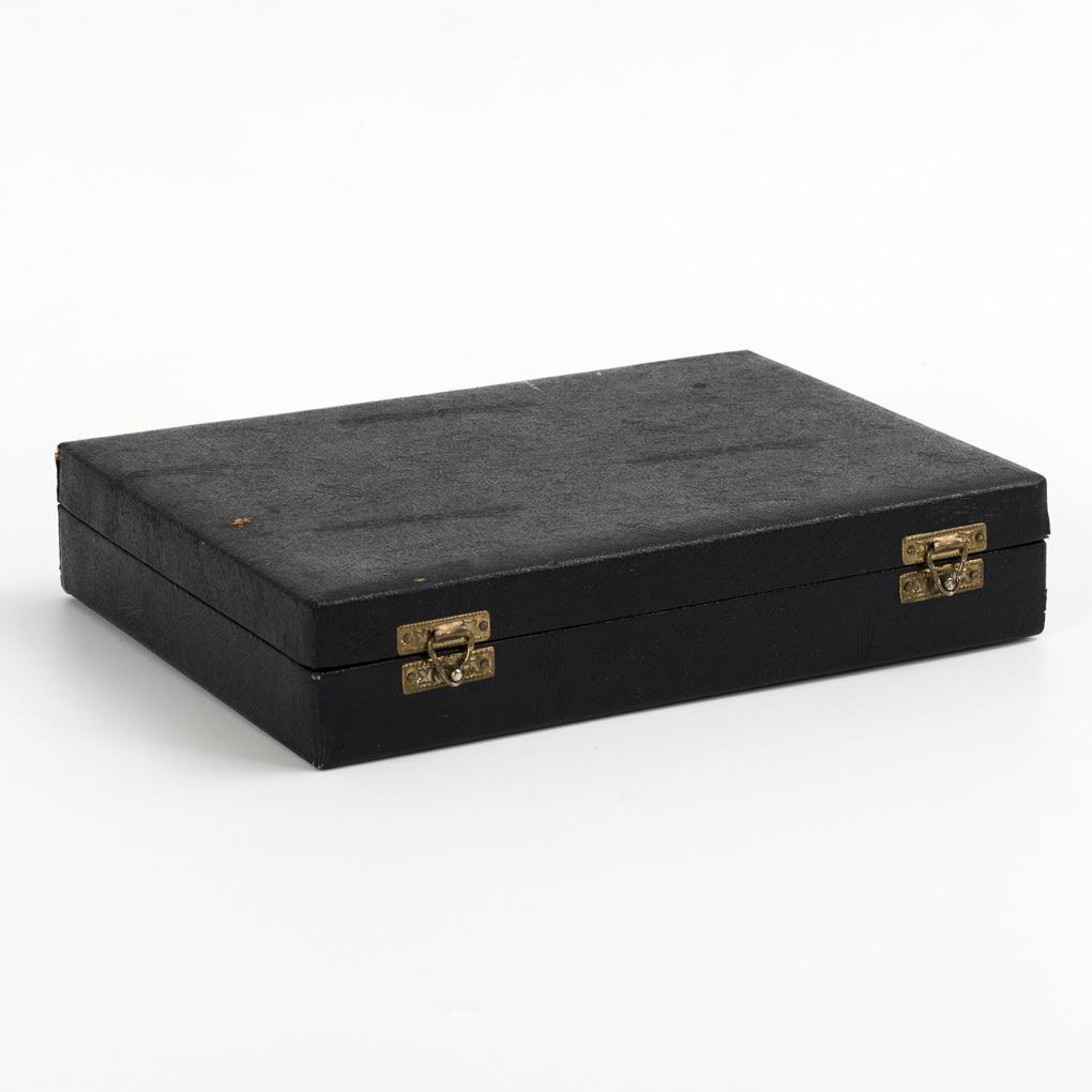 Messingguss, Schatulle mit schwarzem Kunstlederbezug und rotem Stoffbezug innen. Schatulle 5,5 x 25 x 18,5 cm.
