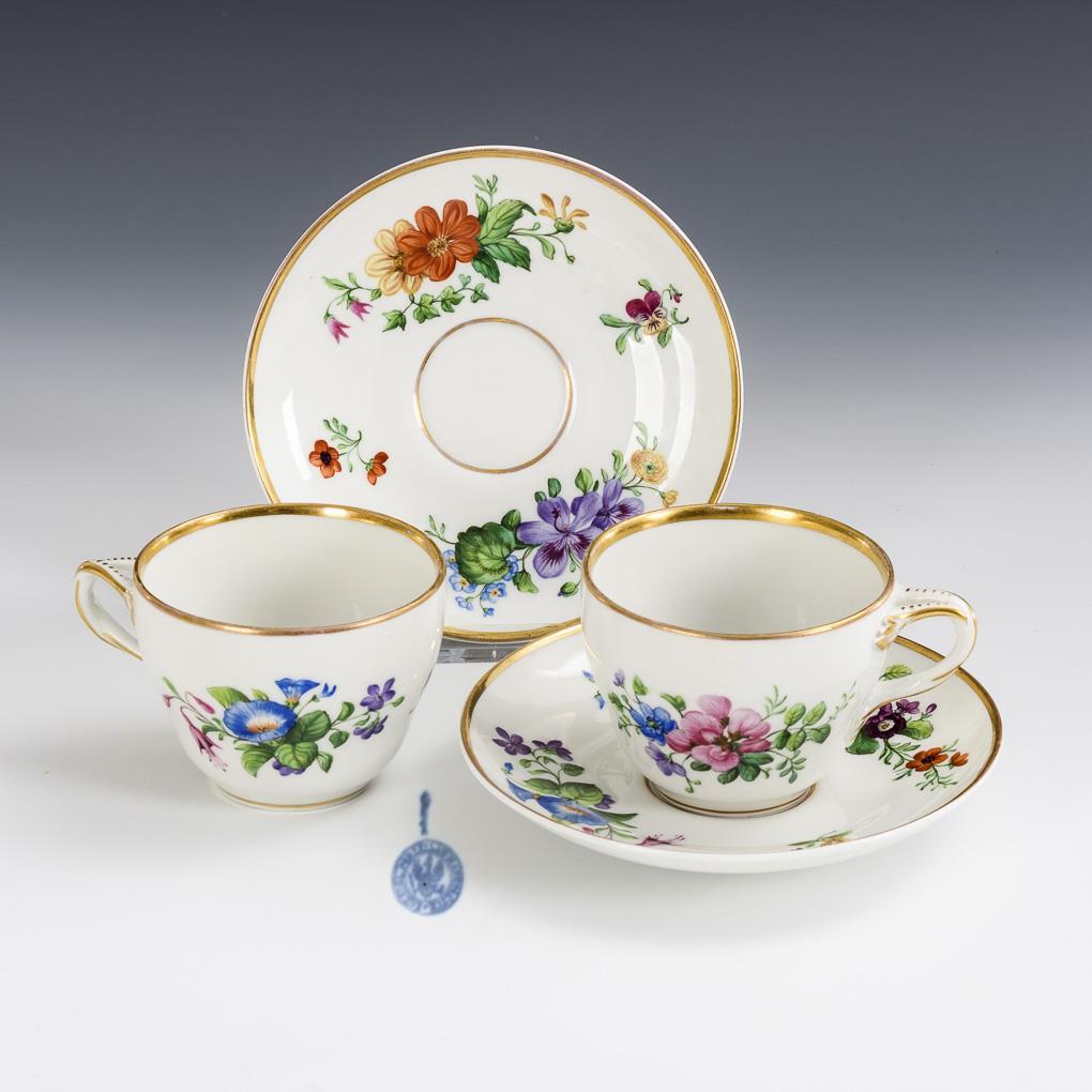 Polychrom bemalt, goldstaffiert. H Tassen 6,5 cm, Ø originale Untertassen 14,5 cm.