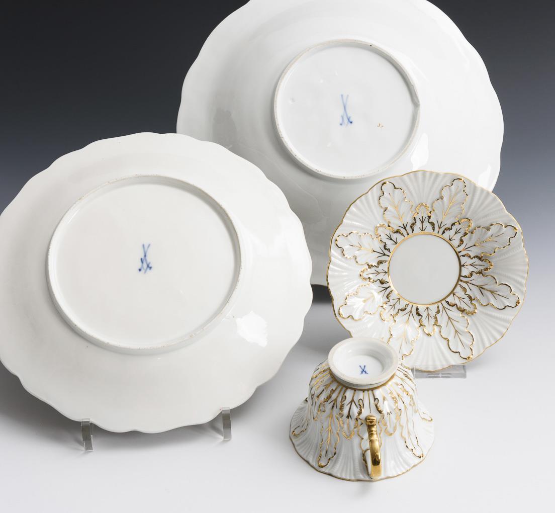 1x Schale mit Windenrelief (Ø 28,5 cm). / 1x Schale mit Weinrebenrelief (Ø 25,5 cm). / Tasse (H 7 cm) und Untertasse (Ø 16 cm) mit Blattrelief. Goldstaffage teils berieben, 1x Standring bestoßen.