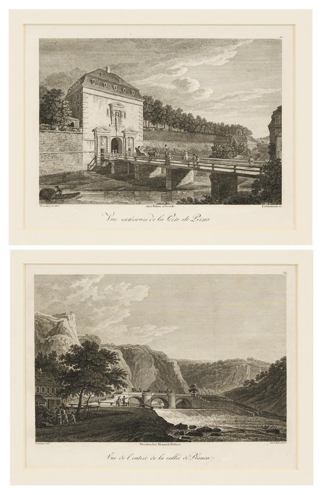 Blatt 21: Blick auf die Hegereiterbrücke und den Plaueschen Grund "Vue de l'entrée de la valée de Plauen" und Blatt 14: Blick auf das Pirnaische Tor "Vue l'exterieure de la Porte de Pirna"; aus: Gottlob Friedrich Thormeyers "Dresden mit seinen Prachtgebäuden und schönsten Umgebungen. Dresde avec ses édifices et plus beaux environs", Dresden, ca. 1820, verlegt von Heinrich Rittner, 2. Auflage mit 26 Tafeln. Nach Zeichnungen von Gottlob Friedrich Thormeyer (1775 Dresden - 1842 Dresden) und Christian Gottlob Hammer (1779 Dresden - 1864 Dresden); gestochen von Philipp Veith, Johann Gottlob Schumann, Johann Adolf Darnstedt, Johann Gottfried Abraham Frenzel und Christian Gottlob Hammer. Je minimal stockfleckig.