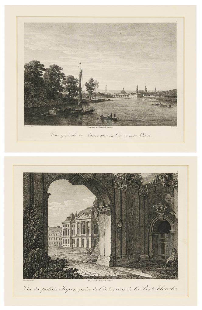 Blatt 1: Blick auf Dresden von Nordwest "Vue générale de Dresde prise du Côté de nord=Ouest" und Blatt 2: Blick auf das Japanische Palais "Vue du palais Japon prise de l'interieur de la Porte blanche"; aus: Gottlob Friedrich Thormeyers "Dresden mit seinen Prachtgebäuden und schönsten Umgebungen. Dresde avec ses édifices et plus beaux environs", Dresden, ca. 1820, verlegt von Heinrich Rittner, 2. Auflage mit 26 Tafeln Nach Zeichnungen von Gottlob Friedrich Thormeyer (1775 Dresden - 1842 Dresden) und Christian Gottlob Hammer (1779 Dresden - 1864 Dresden); gestochen von Philipp Veith, Johann Gottlob Schumann, Johann Adolf Darnstedt, Johann Gottfried Abraham Frenzel und Christian Gottlob Hammer. Je etwas stockfleckig.