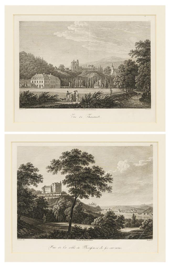 Blatt 22: Blick auf die Burgruine Tharandt "Vue de Tharandt" und Blatt 24: Blick auf Schloss Siebeneichen mit der Stadt Meißen im Hintergrund "Vue de la ville de Meissen et de ses environs"; aus: Gottlob Friedrich Thormeyers "Dresden mit seinen Prachtgebäuden und schönsten Umgebungen. Dresde avec ses édifices et plus beaux environs", Dresden, ca. 1820, verlegt von Heinrich Rittner, 2. Auflage mit 26 Tafeln. Nach Zeichnungen von Gottlob Friedrich Thormeyer (1775 Dresden - 1842 Dresden) und Christian Gottlob Hammer (1779 Dresden - 1864 Dresden); gestochen von Philipp Veith, Johann Gottlob Schumann, Johann Adolf Darnstedt, Johann Gottfried Abraham Frenzel und Christian Gottlob Hammer. Je im Randbereich stockfleckig.