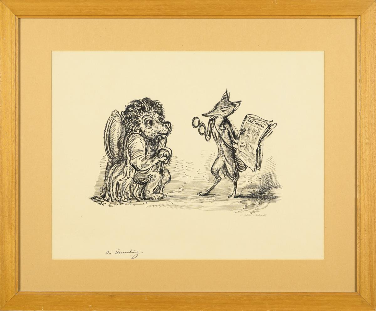 Recto: "Die Überredung", 1960, mit schwarzer Tusche betitelt, Bleistiftsignatur, Tuschmonogramm, Abbildung ca. 22 x 33 cm | verso "Nr. 121 Simplicissimus" - Entwurf für die satirische Zeitschrift "Simplicissimus", erschienen ab 1954, um 1955, Abbildung ca. 30 x 32 cm.