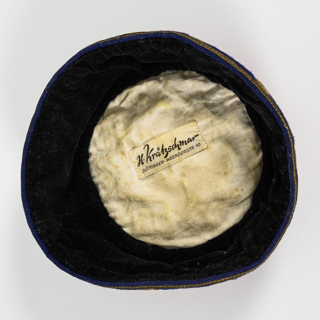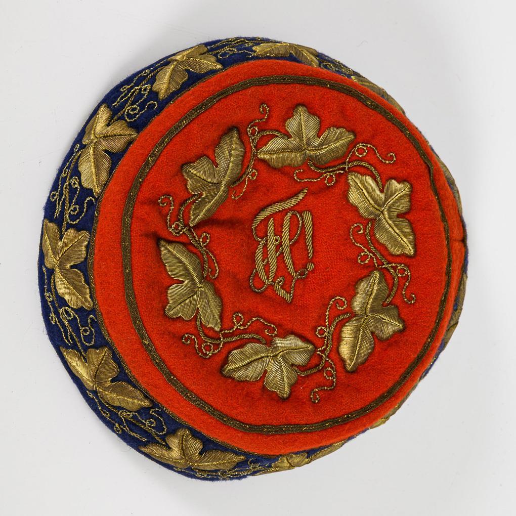 Rot-blaue Kappe mit goldbesticktem Zirkel und Eichenlaub.
