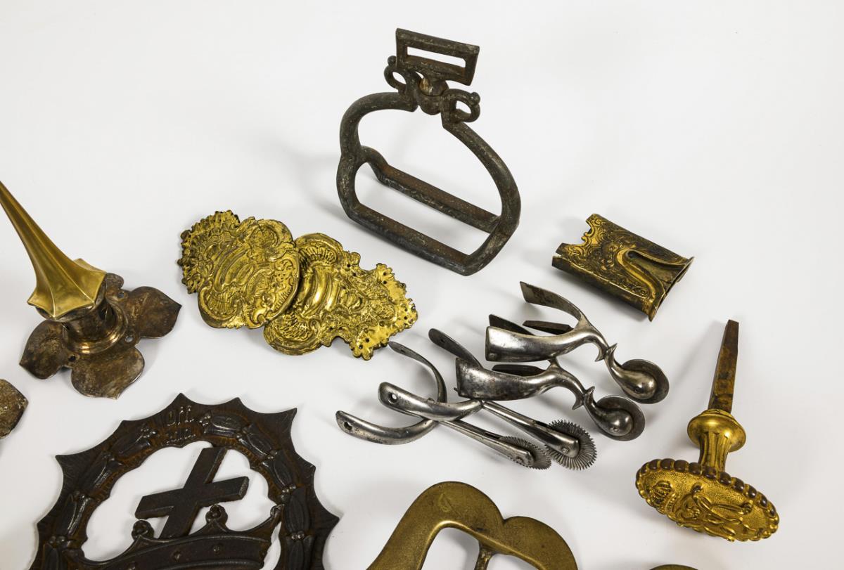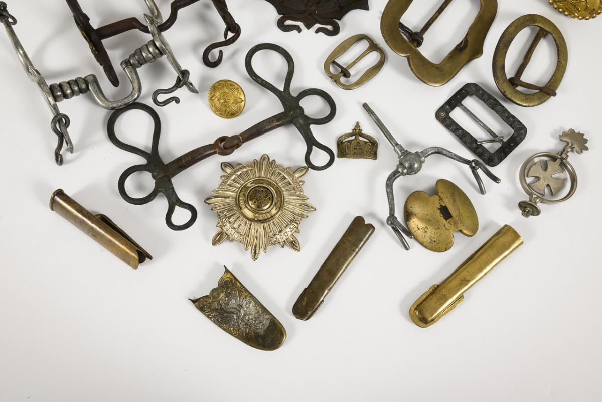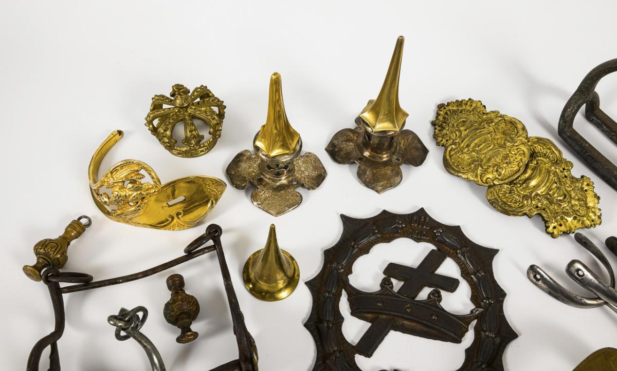 Darunter: 3 Helmspitzen / großer Gardestern / 2 Paar Sporen / plastische Krone H 7 cm / Türknauf mit Monogramm "W II" / 9 Teile für Stichwaffen und Scheiden / 3 große Schließen (evtl. für Pferdegeschirre) / 1 Steigbügel / 3 Kandaren und weiter Kleinteile.