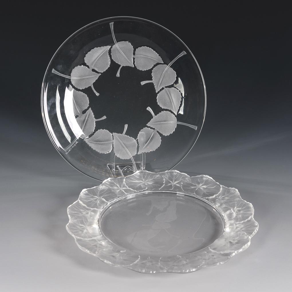 1x Teller mit Birkenblattrelief. / 1x Teller mit Geranienblattrelief auf der Fahne.