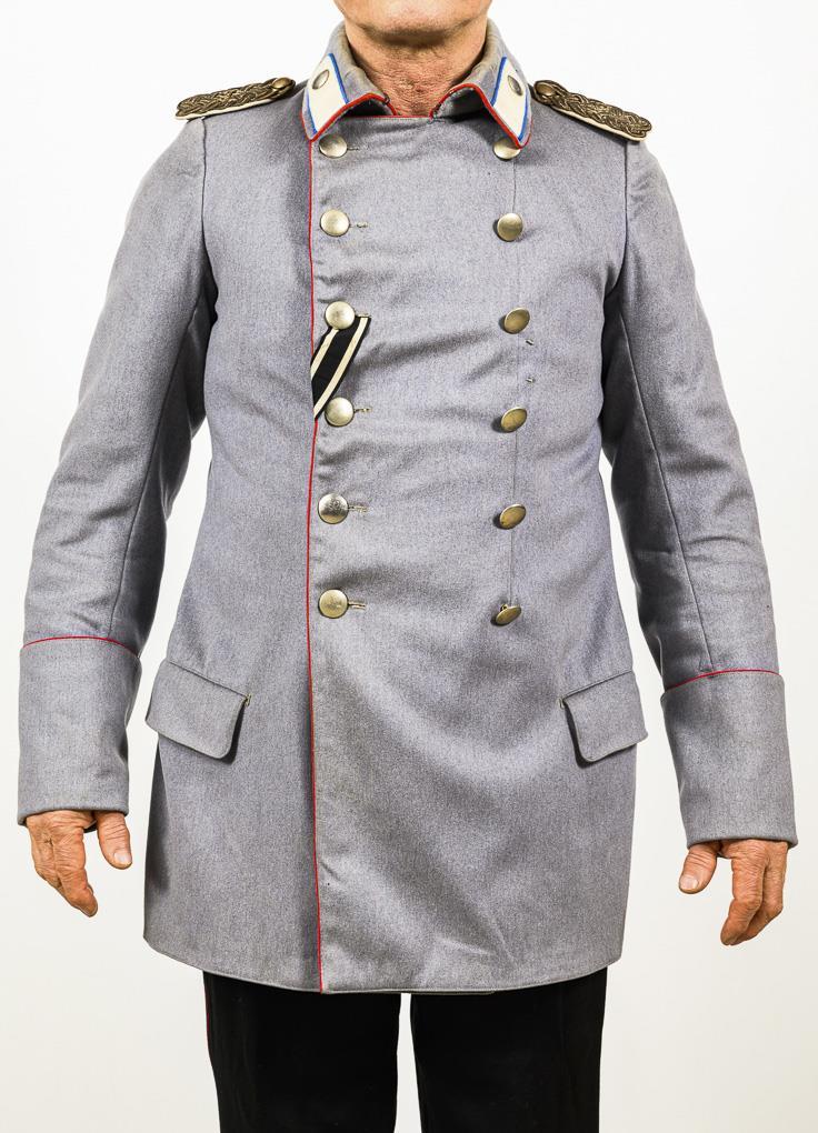 Graues qualitätvolles Tuch mit roten Vorstößen, einfacher Ärmelaufschlag, zweireihige, silberfarbene Knöpfe, EK I Band. Umgelegter Kragen mit weißen Spiegeln und mittelblauem Vorstoß. Tragespuren und minimaler Mottenfraß.