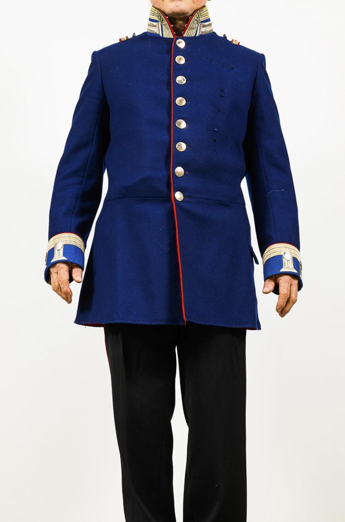 Dunkelblaues Tuch mit roten Vorstößen und mittelblauen Aufschlägen. Einreihig, silberne Knopfleiste, Stehkragen. Innen: Brusttaschen und Tasche in den Rockschößen. / Schwarze Hose mit roten Biesen und ein Paar weiße Lederhandschuhe. Leichte Tragespuren.