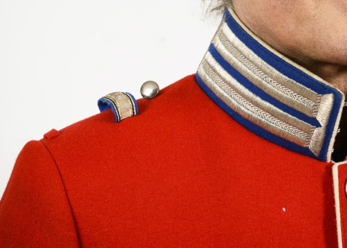 Roter Waffenrock und weiße Hose.