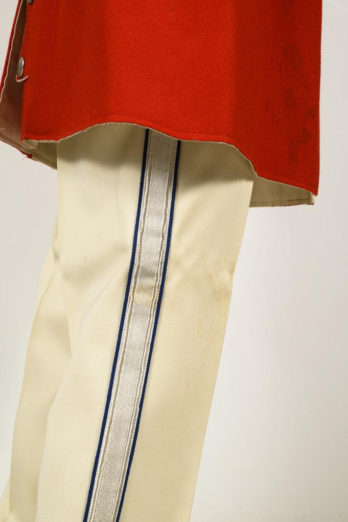 Jünger nachgenähter Uniformrock. Rot mit weißen Vorstößen und mittelblauen Aufschlägen, Stehkragen. Vorn fleckig. / Dazu weiße Hose mit silbernen Seitenstreifen und blauen Vorstößen.