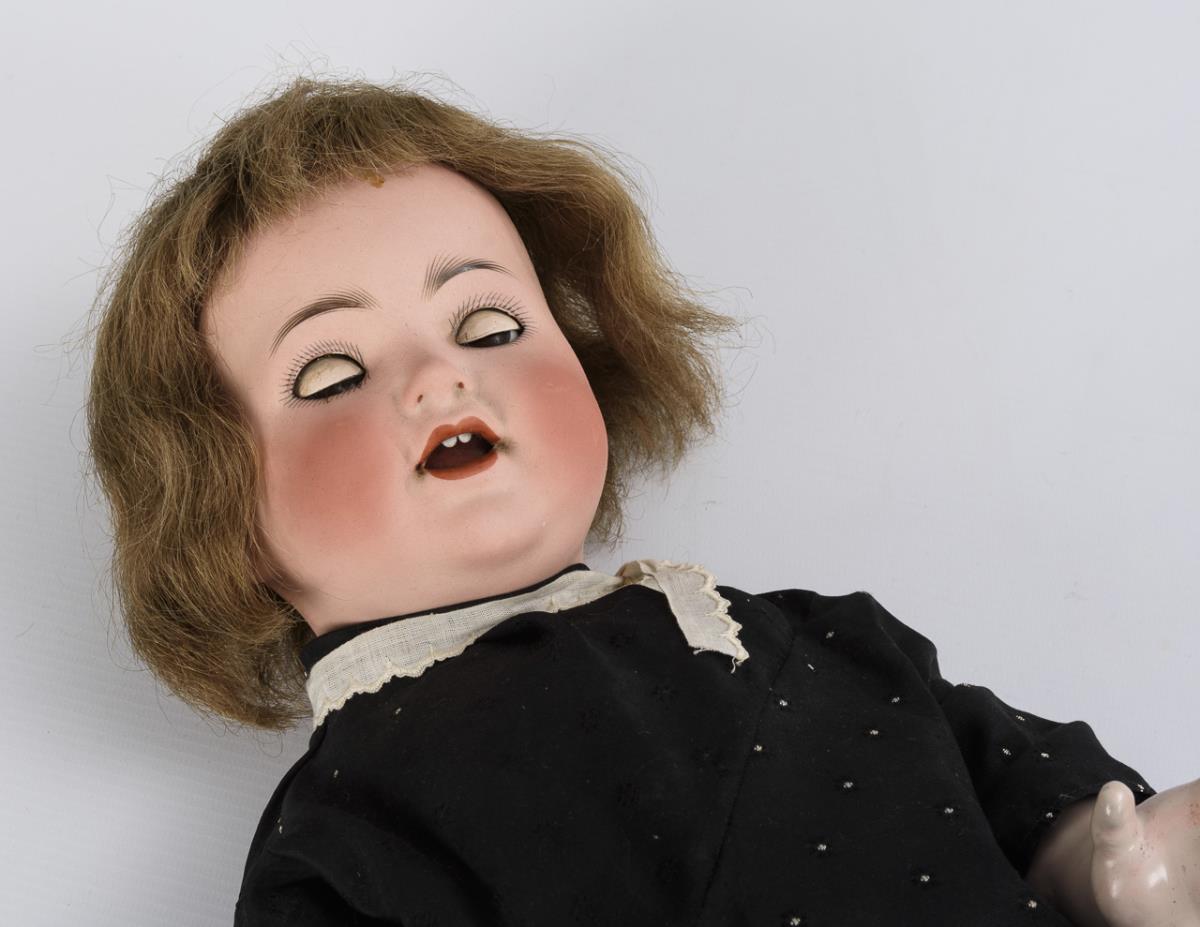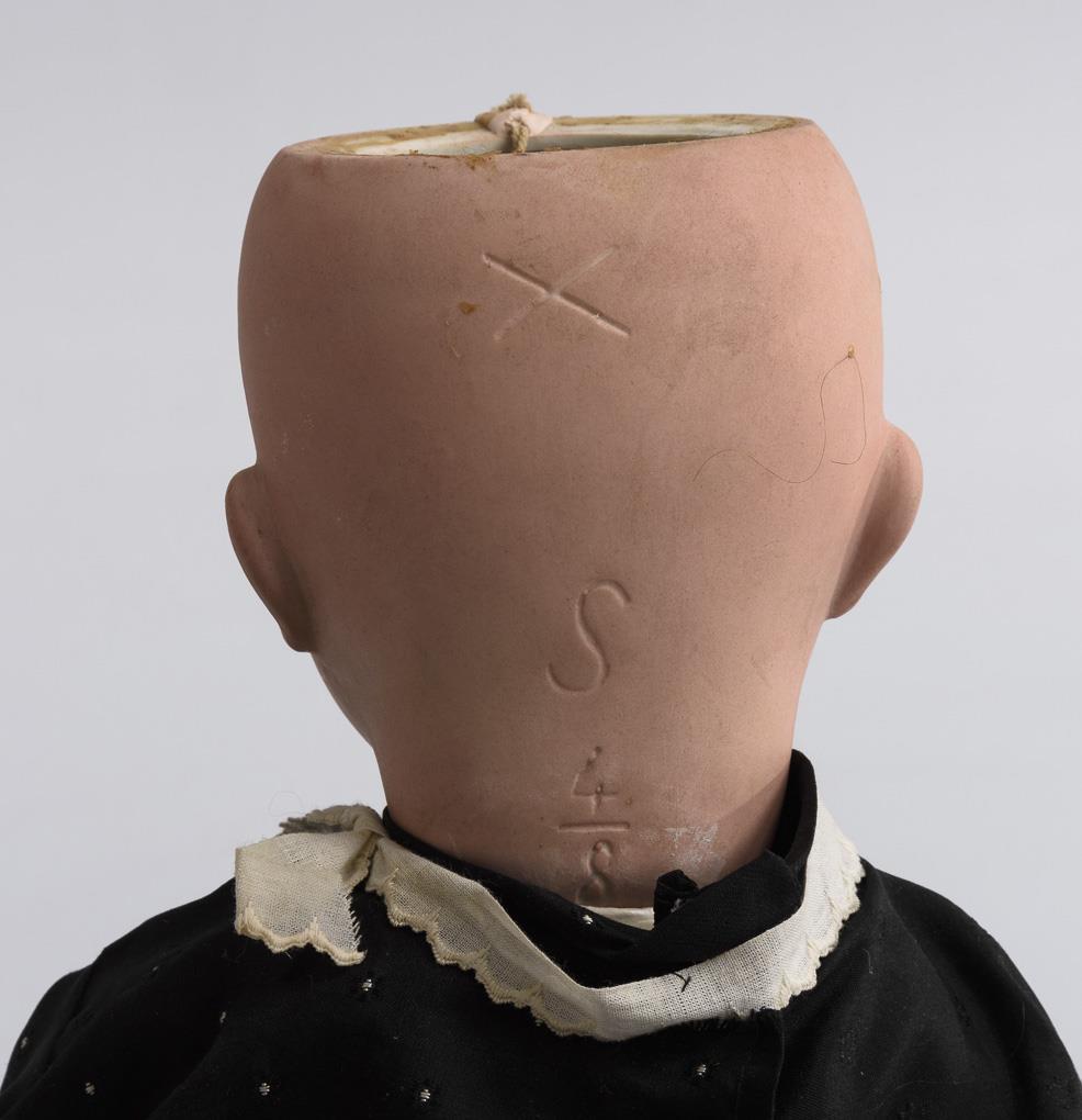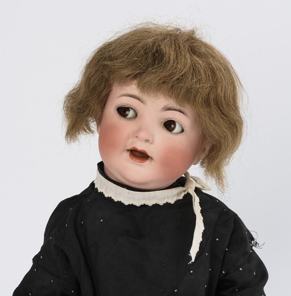 Kurbelkopf, braune Schlaf-/Schelmenaugen, dunkelblonde Mohairperücke. 5-teiliger Sitzbabykörper mit Stimme. Schwarzes Kleid. Kopf durchleuchtet: ohne Defekte. Körper wohl nachlackiert, 1 Fingerspitze repariert.