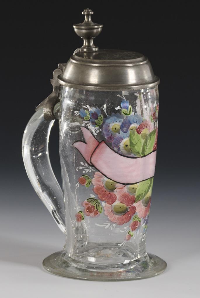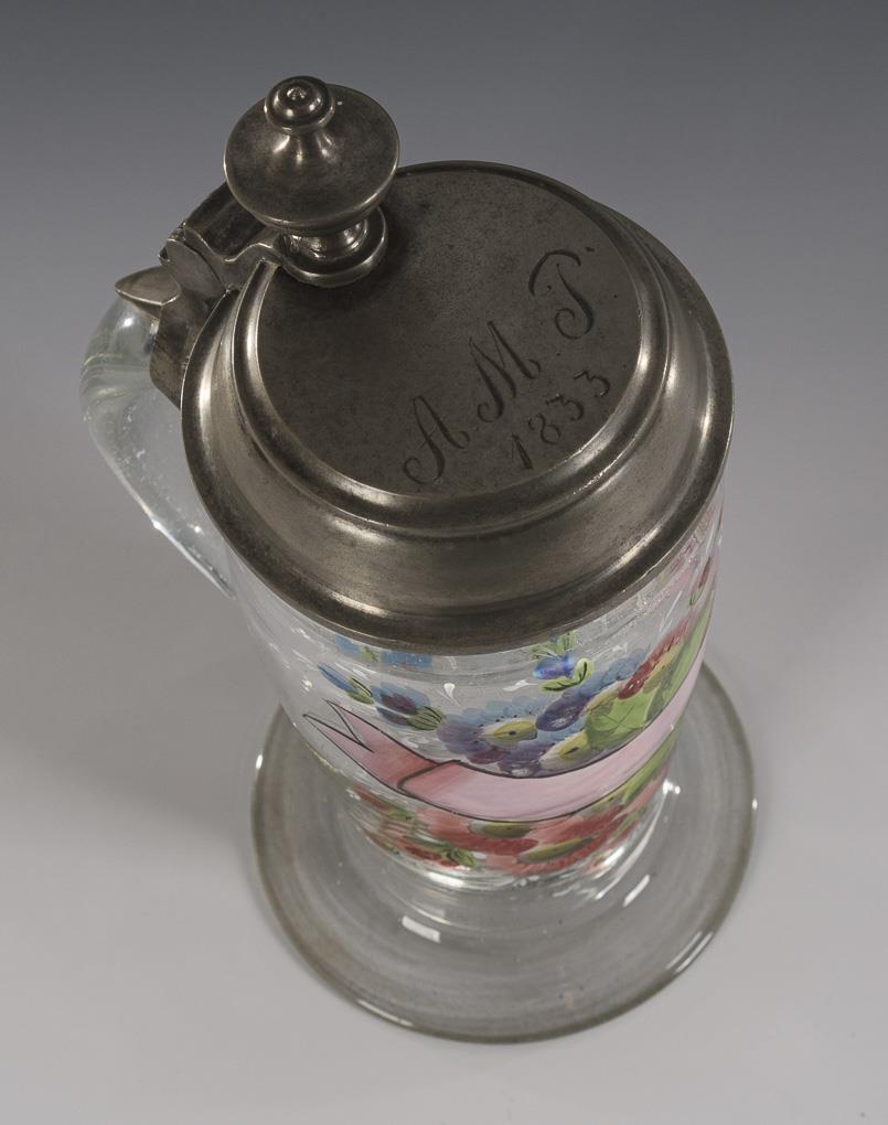 Leicht konvexer Krug mit Bandhenkel, breitem Stand und zinnmontiertem Scharnierdeckel; Abriss. Schauseitig ein Blumenbukett mit rosa Band, darauf die beriebene Aufschrift "Andenken der Freundschaft", auf dem Deckel die Gravur "A. M. P. 1833".