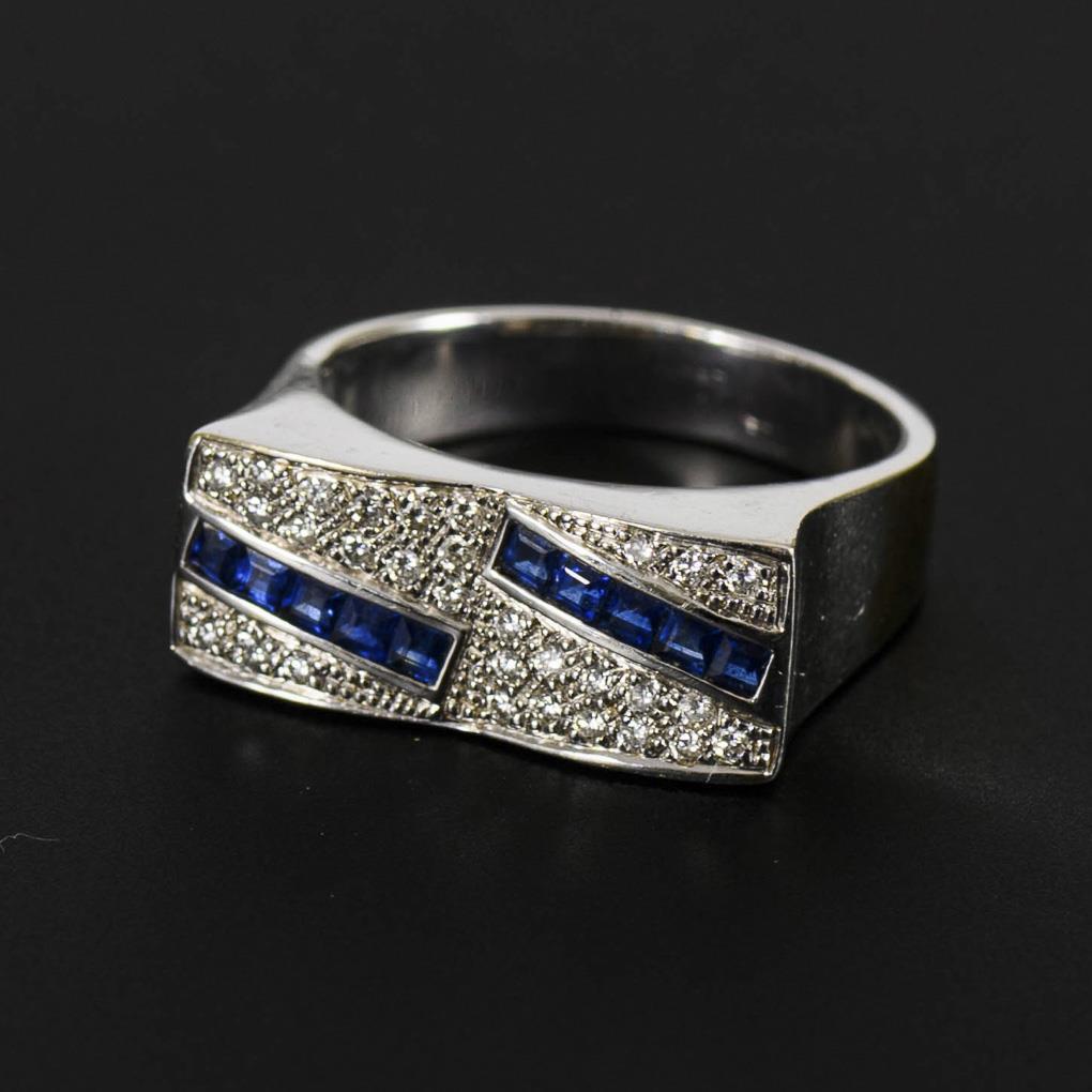 Weißgold 750 geprüft. Saphire total 0,80 ct. Brillanten total 0,24 ct. Ringgröße 60. 9,5 g.