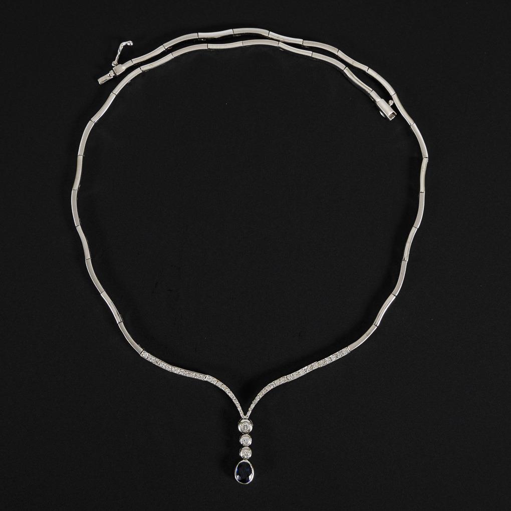 Weißgold 750 gestempelt. Saphir ca. 0,74 ct. Brillanten gesamt ca. 0,54 ct. Kette Ø 14 cm. 24,7 g.