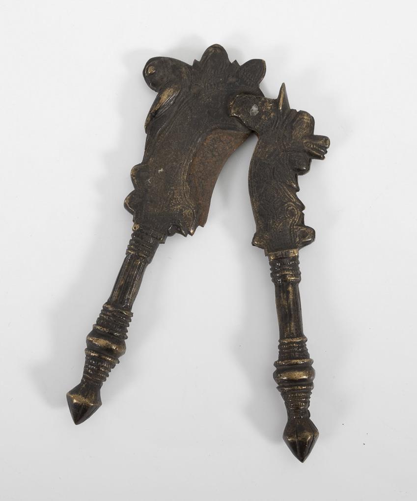 Schön verziertes Stück mit korrodierter eiserner Schneide und Fabelköpfen als Verzierung. Alters- und Gebrauchsspuren.