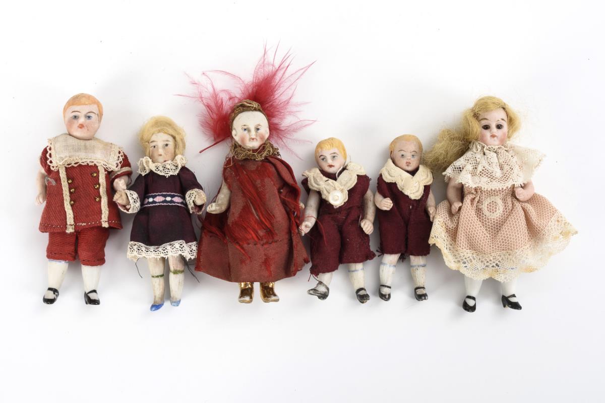 Verschiedene Ganzbiskuit-Püppchen, alle mit festem Kopf, gemalten Augen (1x braune Glasaugen) und gedrahteten Gliedern. 5x rote Kleidung, 1x in rosa Kleidchen. Keine Defekte sichtbar, eventuell kleine Ergänzungen.