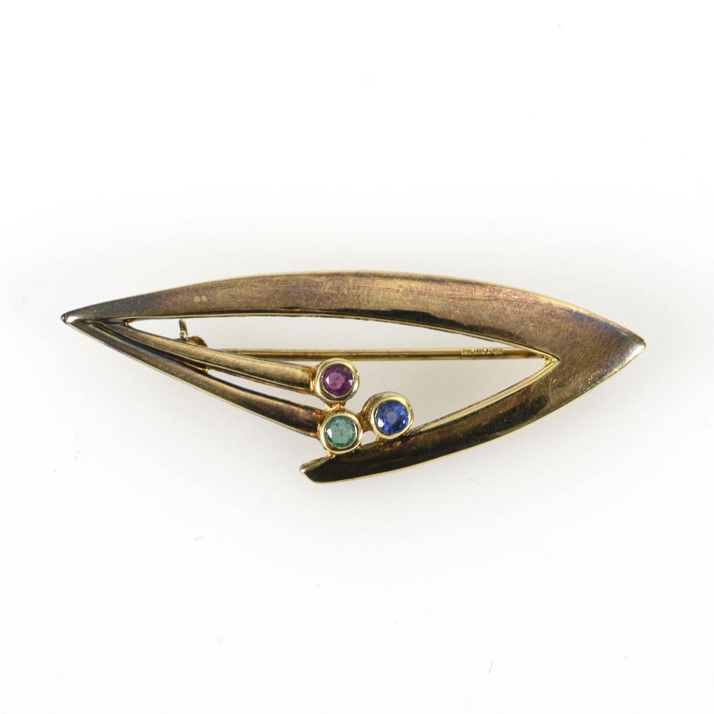 Rahmenbrosche mit kleinem, zargengefasstem Rubin, Saphir und Smaragd. Kugelhaken.