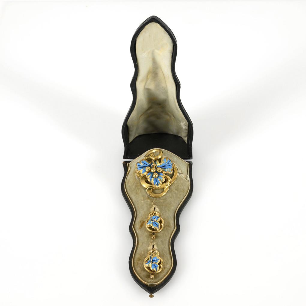 Biedermeier-Demi-Parure mit Email, im Originaletui.