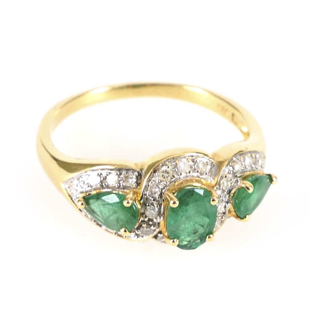 3 krappengefasste Smaragde und 24 kleine, eingelassene Diamanten zwischen schmaler Schiene.