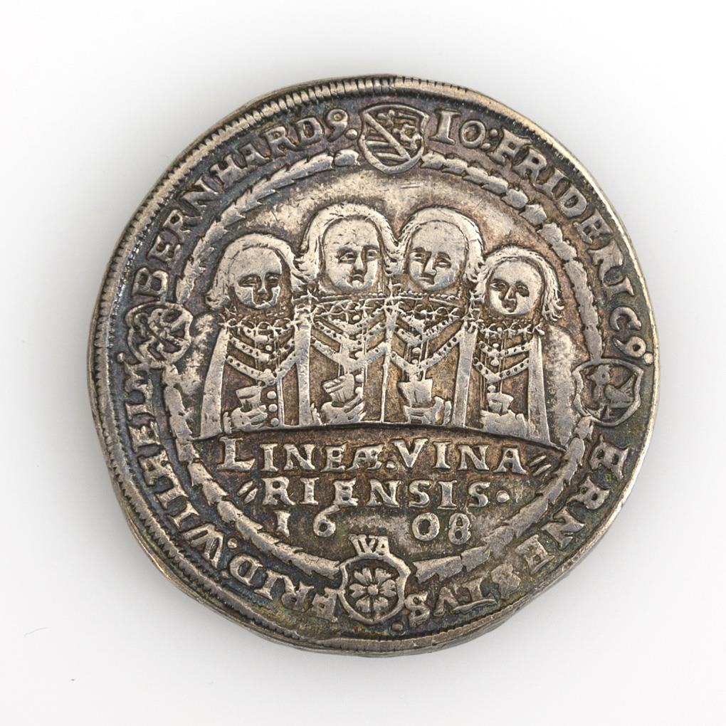 Avers Hüftbilder der 4 älteren Brüder, Legende "D G IO ERNES FRIDERICVS WILHELMVS ALBERTVS", unter den Bildnissen "MON NOV ARG VIII. FRAT DVC SAX". Revers Hüftbilder der 4 jüngeren Brüder, Legende "IO FRIDERICꝰ ERNESTVS FRID WILHELM BERNHARDꝰ", unter den Bildnissen "LINEAE VINA RIENSIS 1609", Münzmeisterzeichen WA. Zustand: Sehr schön, unregelmäßiger Glattrand.