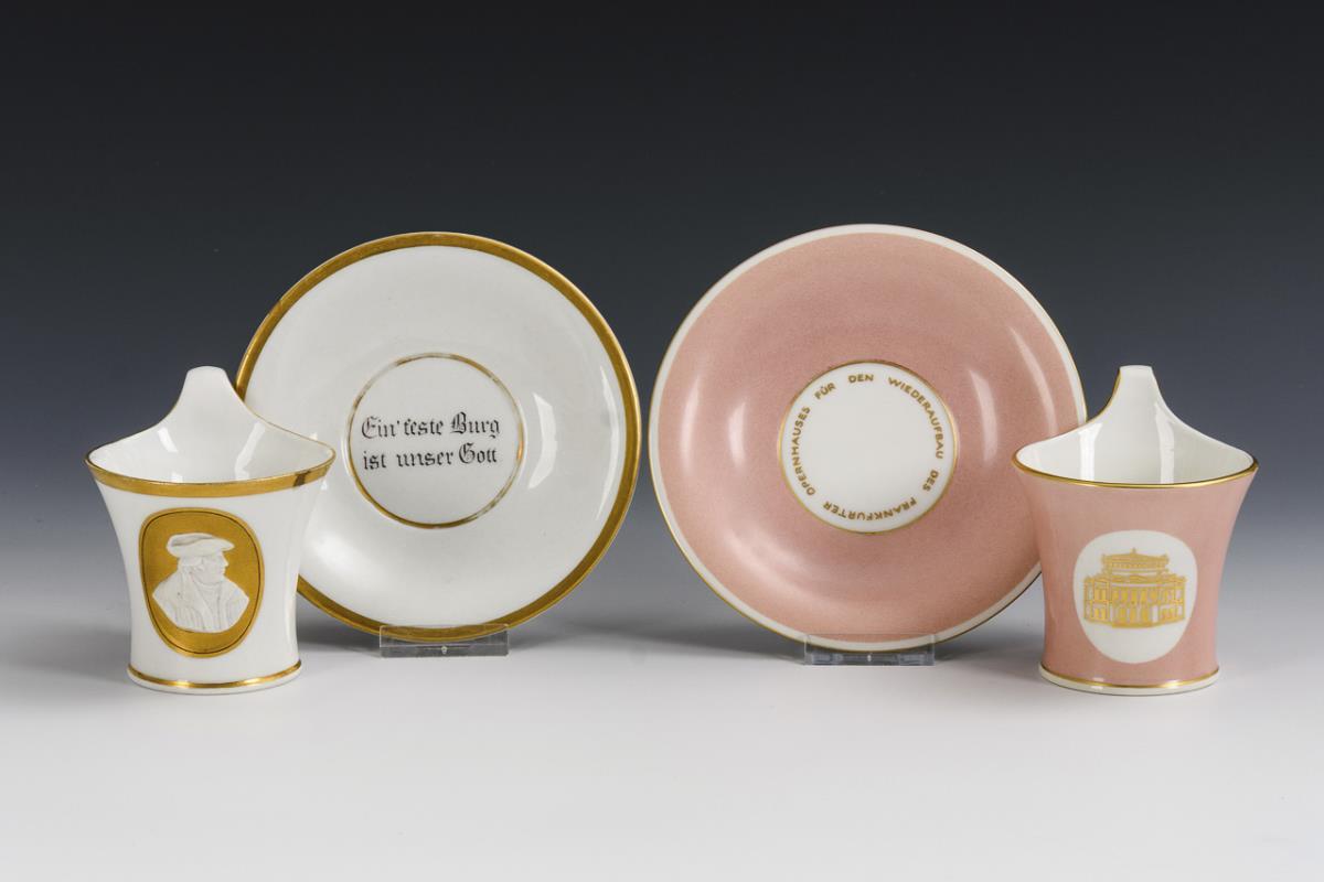 1x Empire-Tasse mit einem schauseitigen Medaillon mit Goldfond sowie dem Biskuitreliefporträt Martin Luthers, im Spiegel der Untertasse die Lutherworte "Ein feste Burg ist unser Gott". / 1x mit rosa Fond sowie der schauseitigen Darstellung der Frankfurter Oper, im Spiegel der Untertasse die Bezeichnung "Für den Wiederaufbau des Frankfurter Opernhauses". Untertasse der Empire-Tasse mit Haarriss und Randrestaurierung.