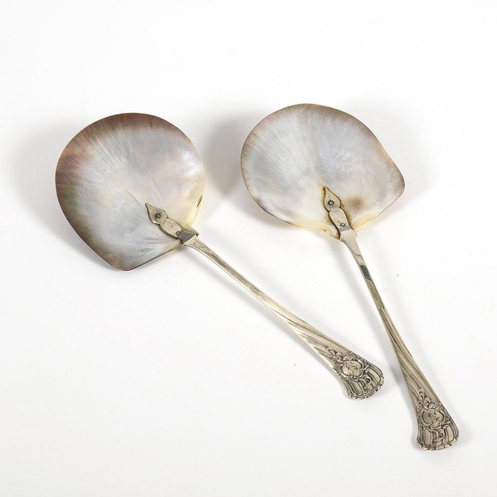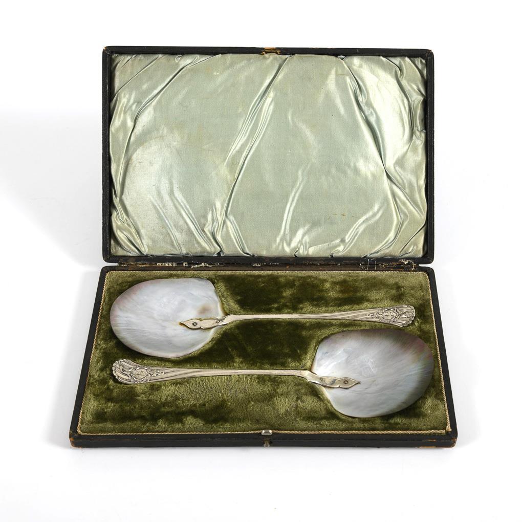 Tahiti-Muscheln mit versilbertem Griff und Monogramgravur "G". In dunkelbraunem Etui. Kleine Randchips, 1 kurzer Riss an den Muscheln.