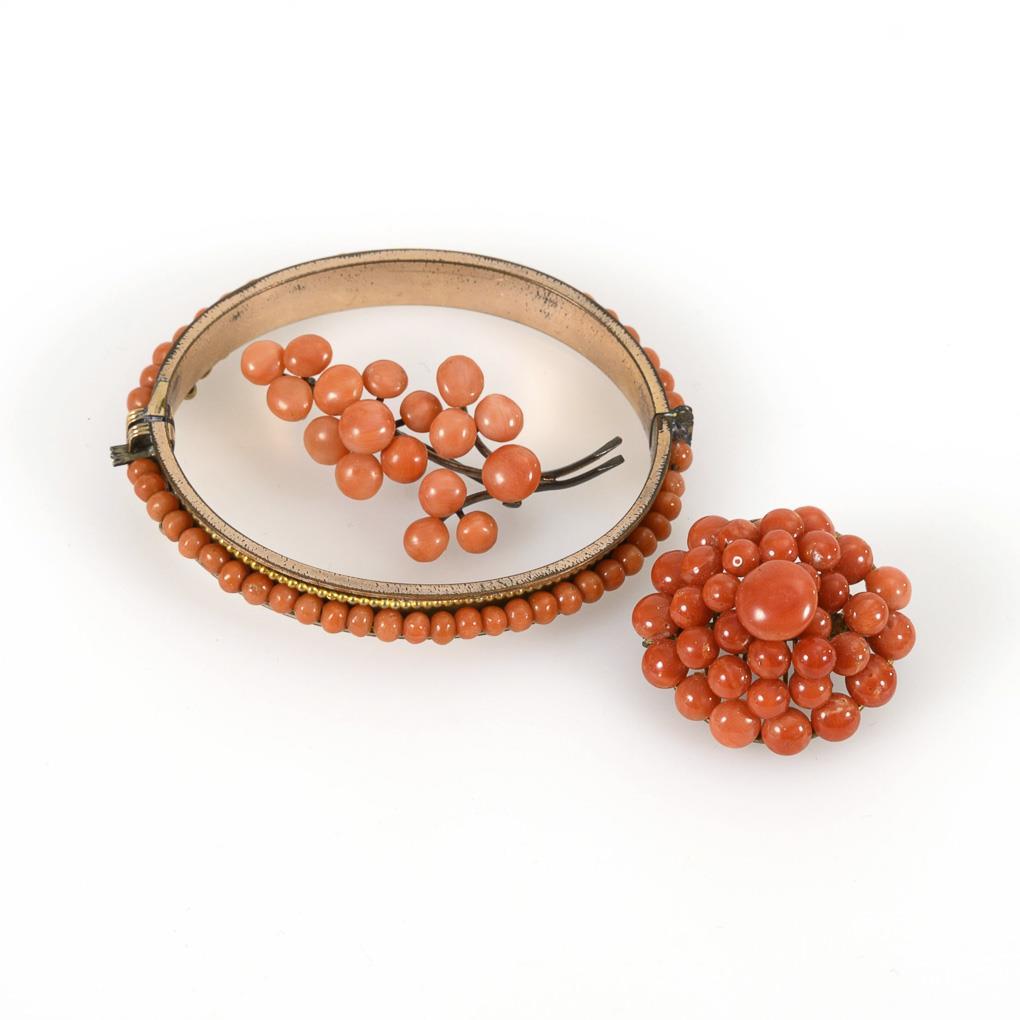 Korallenarmreif und 2 Korallenbroschen um 1900.
